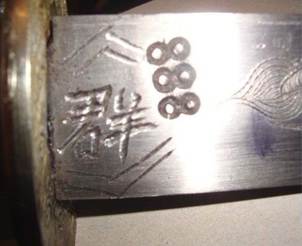 经过2个多小时的再加工,上述问题完全解除了,剩下的就是进一步细致处理了。另外在拆下刀柄的过程,发现做刀装的匠人不小心把刀柄处的刀芯子淬上火了,这样就会无意使刀芯子脆性加大,更容易断裂。于是我们只能对刀芯子重新进行退火,再进行剩下的过程,经过我们的认真检查和处理一切完美了。在这里只是希望匠人以后再这方面稍微留心点就会给刀的质量产生大幅度提升,呵呵。