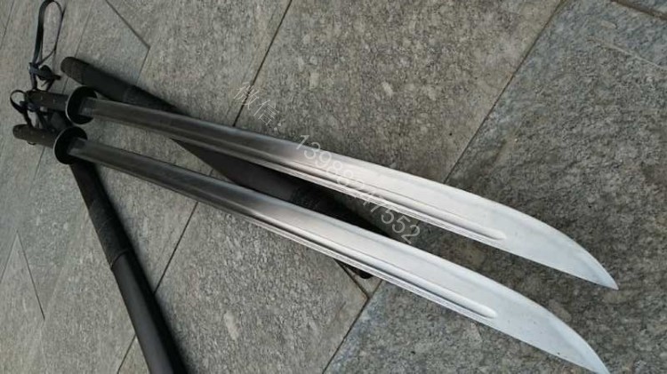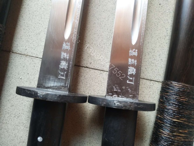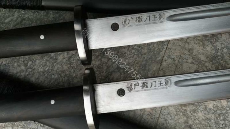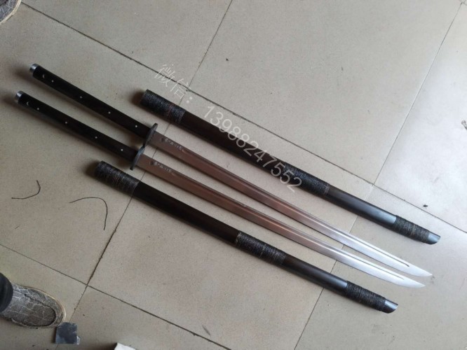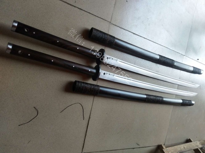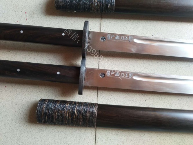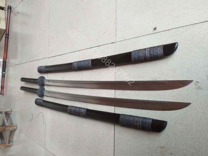 此刀为长期老客户定制的两把沧州苗刀,外形和款式为沧州苗刀经典款式,再进一步完善,刀条采用一体全龙骨刀身,这比普通的沧州苗刀会更加结实耐用,刀柄依旧采用经典沧州苗刀款式,前段较细后端逐步加粗,这样有手握更牢的效果,刀柄刀鞘为黑檀木外缠棕丝制作方法,坚固代用,带有户撒传统血脉,刀条为户撒锻造方法锻造刀身,刀条由户撒刀省级非物质文化继承人杨茂方全手工锻打并淬火,性能超众刚柔相济!刀柄尾端手工加钢垫还可做锤击使用,刃长90厘米左右,全长120厘米左右。此刀客户爱不释手,在微信圈展示后得到众多刀友的支持和定制。
