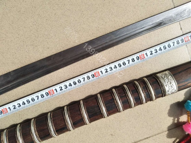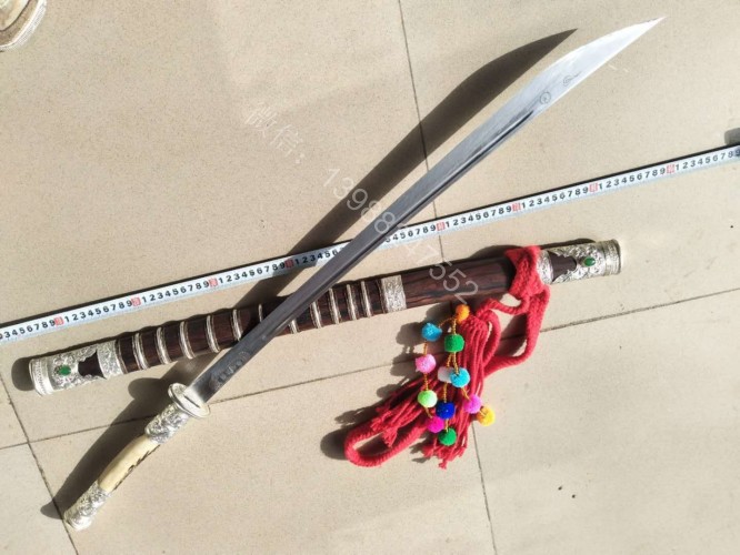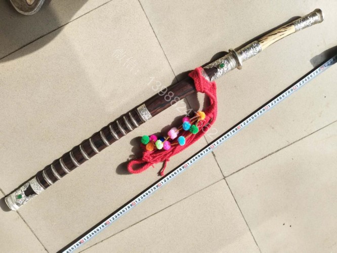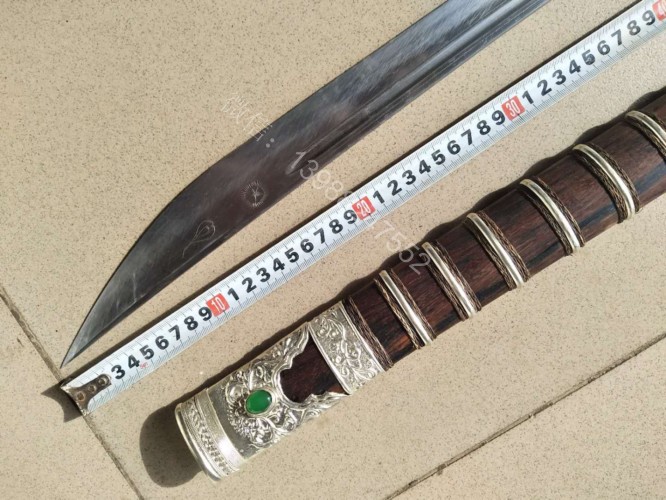 这把精品户撒刀是给客户定做即将完成时候拍摄的,现已发走,这把刀采用户撒传统苗刀的款式,又有人把它称作牛尾刀,刀条是名匠手工锻打并配方淬火而成,刀鞘采用优质进口黑酸枝手工制作,外包缅银配饰,缅银上给客户镶嵌绿色翡翠,手柄也采用野生鹿角制作,整刀凸显原始的粗犷和华贵,户撒刀为恢复古代军刀的制作标准,所以刀条都是手工锻打并手工磨刀,精细度方面不及那些机器高速抛光出来的机制刀,但因为机器高速抛光会导致刃口部分退火而硬度降低,户撒刀纯手工磨刃口,所以有效的杜绝了刃口退火硬度降低的现象,因而刃口显得异常坚硬,斩钉截铁,下面几张图片为即将完工的随便拍摄,稍加整理给大家展示。真正完工后更加精细漂亮!因要发的货较多,所以没时间再来拍摄。