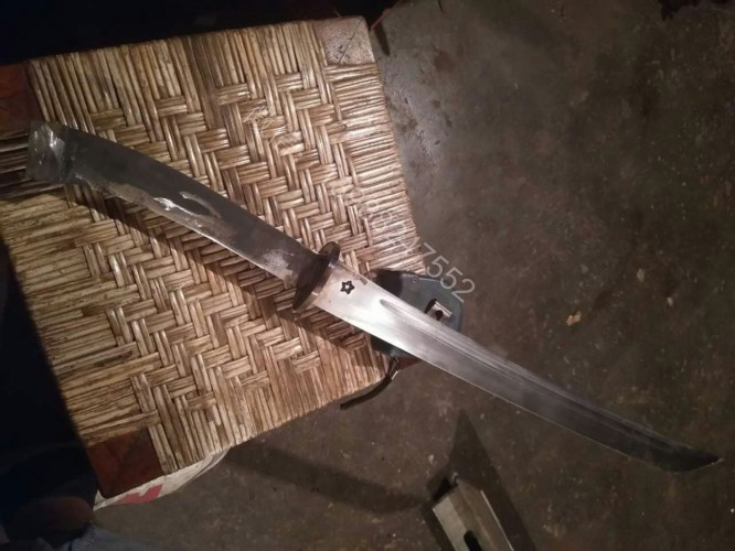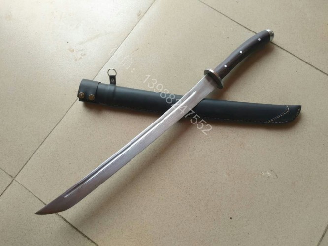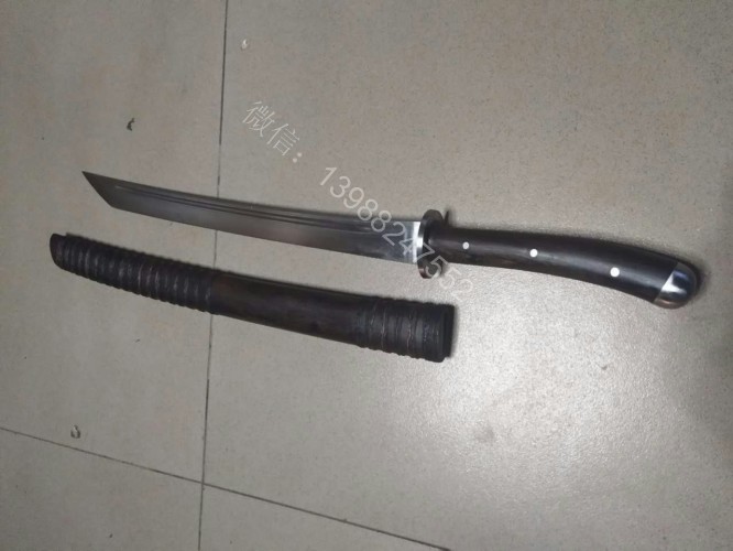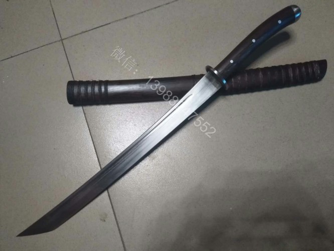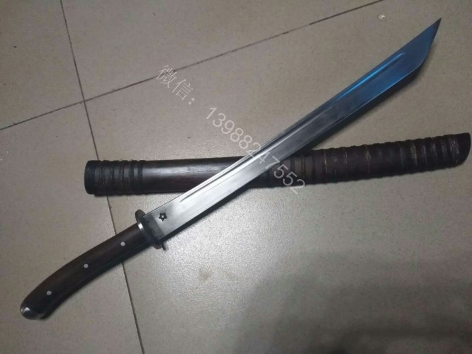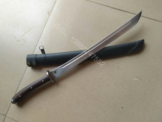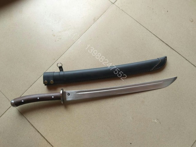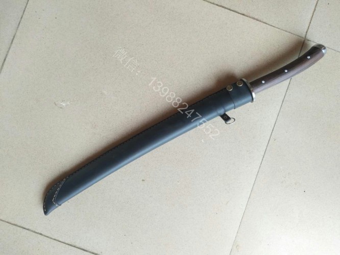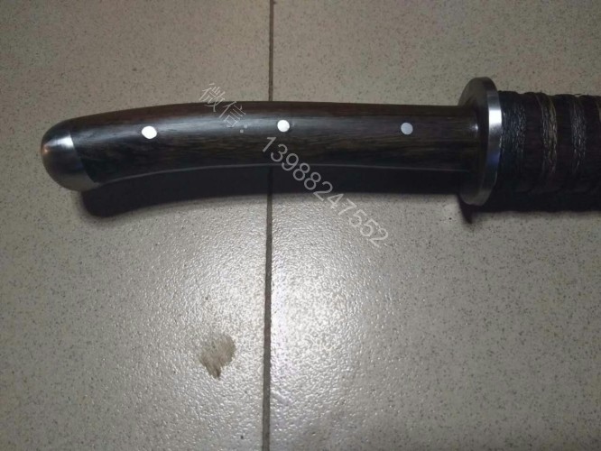 此马刀为给客户定做的中号尾部加钢一体全龙骨马刀,此马刀长短适中,很适合中等身高的男士挥舞使用,一体全龙骨的骨架,结实耐用永不断裂!刀条为户撒刀名匠线乔发早期的作品,属于库存的刀条,性能十分出众,粗锋轻松砍铁,细锋可以过矿泉水瓶,尾端手工加钢垫,适合户外必要时刻当锤击使用!此马刀配木鞘外包牛皮,更加方便携带,手工制作的刀柄也是根据使用者握刀方式和使用习惯制作,所以手感极佳!图片是制作过程随意拍摄的,场地灯光比较昏暗,效果不太好,刀成品也是非常漂亮!而且皮壳马刀性价比是非常高的!