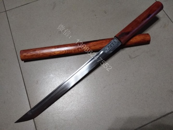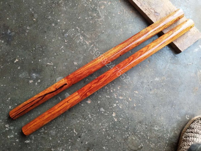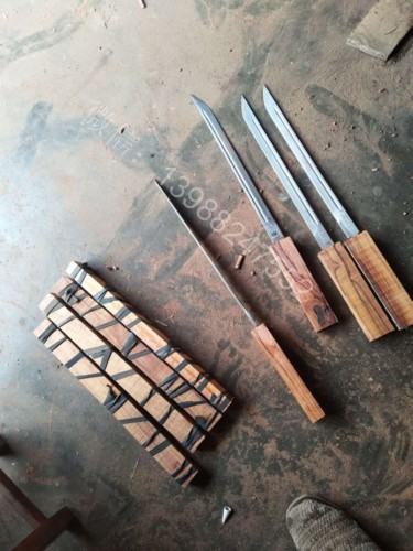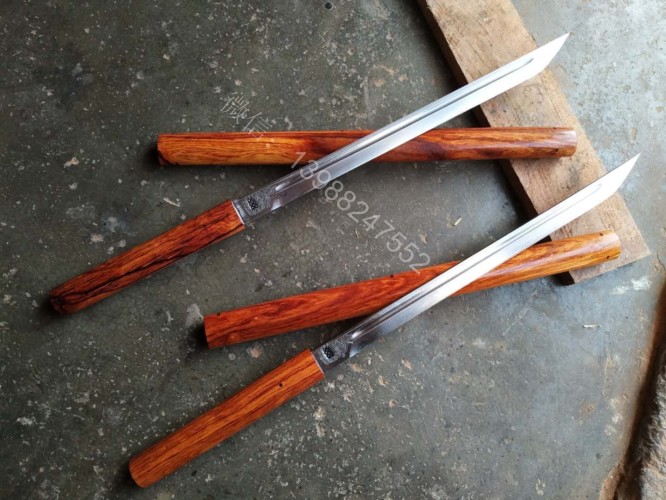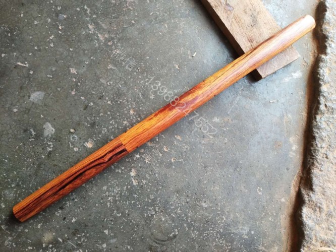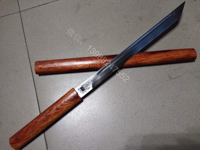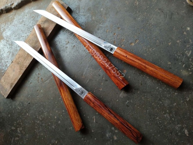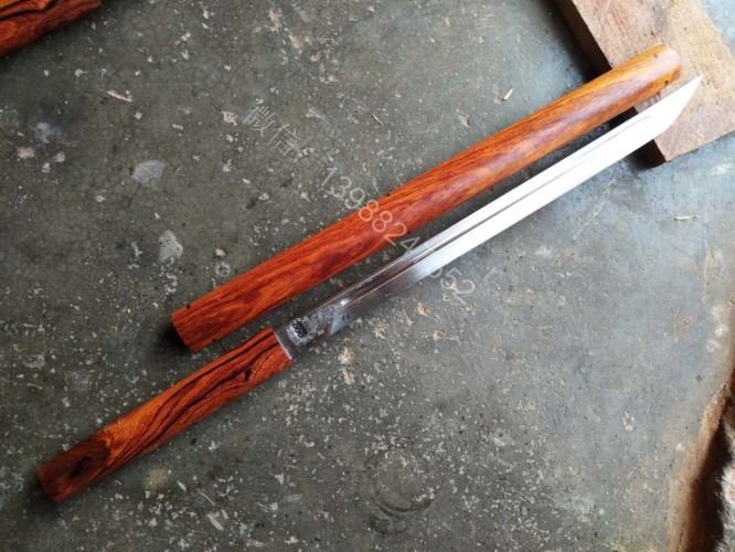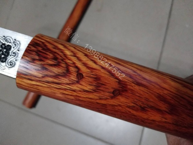 此户撒棍刀为我们独家设计制作的款式,一经推出立即获得的广大刀友的喜爱和推崇,此刀刀条为户撒刀第一刀匠线乔发全手工锻打制作,刀条精美修长,刃口坚硬锋利,砍铁过竹不在话下,刀柄刀鞘为精选缅甸红酸枝纯手工制作,刀与刀鞘的结合严丝合缝,棍刀合上后完全看不出来是一把刀,就像一根人畜无伤的把玩木棍,但遇到危急时刻抽出确是一把寒光闪闪的刀,刀鞘全部为手工木销钉契合,看不到金属铆钉螺丝的痕迹,使得整体棍刀更显得精致漂亮!下面是制作工程的随拍,大家可以欣赏一下!
