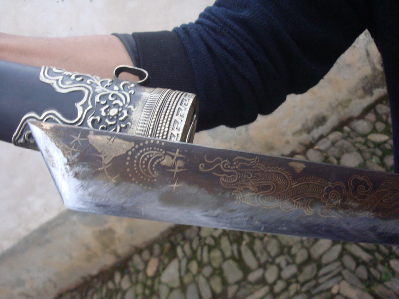 著名户撒刀名匠线乔发是户撒刀王项老赛妹夫,在户撒刀的锻造方面有着极高的知名度,由他打出来的刀性能稳定,刀型优美标准,处处散发着匠人内心深处对这种历史悠久冷兵器的独到见解和灵性!线乔发做的刀不仅性能卓越,而且刀面的手工雕花技艺在众多刀匠中也堪称一绝!他在刀身雕刻的龙凤花草图案具有浓重的民族特点,栩栩如生,获得众多国内外刀友的交口称赞,他还有一项绝活,就是在这些雕刻图案上的走铜工艺,就是用液态的铜水走进雕刻纹理,并和钢材紧密融合,具体技术只有匠人自己心理了解,这里就不做详述,下面请大家欣赏一下户撒刀王线乔发独到的走铜技术: