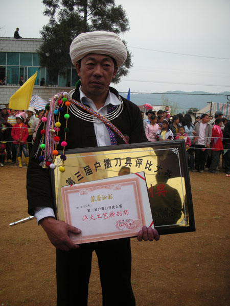 土生土长在这里的项老赛,刀打得好是有口皆碑。2006年,在阿昌族的阿露窝罗节上的民族手工艺比赛中,项老赛的刀轻松获得了头牌,至此之后,项老赛的刀开始在本地乃至外地频繁地得奖。再后来,刀王的称号便自然而然落到了项老赛的头上。名气大了,刀王项老赛的底气也明显足了,和陌生人打交道时,要是对方不知道他的来头,那项老赛在自我介绍的时候,就会拍拍胸脯来上一句:“我,刀王,项老赛啊!”因为打刀,项老赛的大拇指明显比一般人要粗大,而手臂也较一般人结实些。