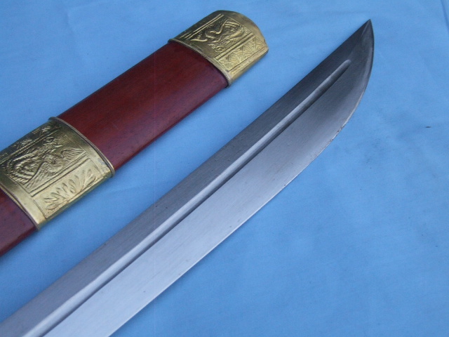 产品介绍: 此刀是户撒名匠全手工打制的珍藏版紫檀精铜装极品马刀,刀身采用汽车弹簧钢板手工锻打淬火,刀身精雕龙凤等花纹,精铜红木刀装,做工精良,刀的钢火一流!刀鞘刀把为存世稀少的缅甸紫檀木.镶饰精美纯铜装,独具一格的刀款华贵古朴大方,可过竹削铁,存世只此一把,极其收藏价值!!