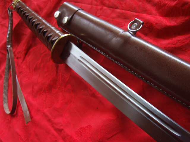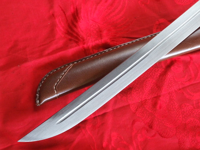 产品介绍: 此刀由户撒名匠全手工打制的精品马刀,刀身采用汽车弹簧钢板手工锻打淬火,刀身精雕龙凤等花纹,刀条两面拉有长短血槽,棱形刀型款式新颖做工精致。刀鞘为真皮.配置纯铜刀镡,刀把全龙骨,刀背屋脊型,为纯手工特制精品武刀,硬度、韧性高,锋利!!