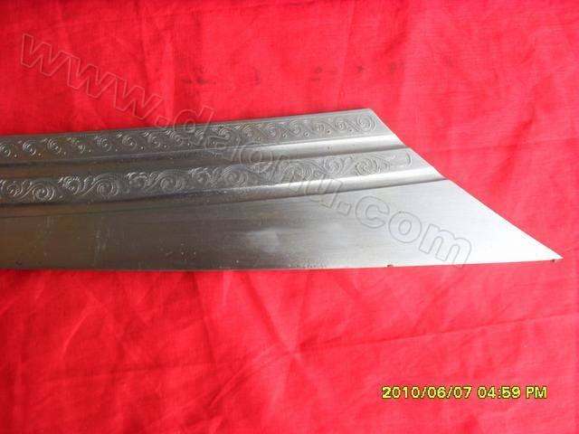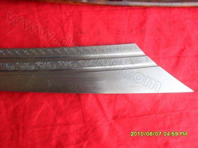 产品规格: 全长107CM 刀长:86CM 刃长:60CM 刀宽:5-6CM产品介绍: 此刀由户撒名匠全手工打制的精品镇宅斩马刀,刀身采用汽车弹簧钢板手工锻打淬火,千锤百炼而成,刃口坚硬可砍断铁钉不伤刃,如精细开锋可锋即可锋利无比,刀身精雕龙凤等花纹。刀装采用缅甸及其名贵的鸡翅木精雕细琢而成,整体感官大气高贵,气势如虹!收藏集玩家的首选!此刀本月精品现货!收藏极品! (商品图片经压缩清晰度下降,真品更好),另外答谢刀友,购买此刀者赠送下图精品刀架(价值500元)