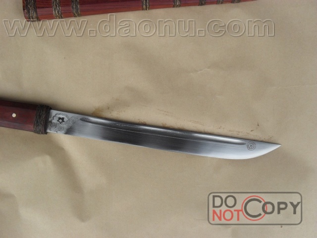 产品介绍: 此刀由户撒名匠线乔发全手工打制的极品短刀,刀身采用汽车弹簧钢板手工锻打淬火,刀身精雕龙凤等花纹,刀鞘为缅甸红木制作.刀把为也红木木制作,刃口经乔发精心打磨,可轻松刮汗毛,极具收藏价值,收藏极品!