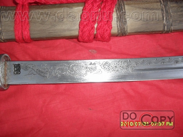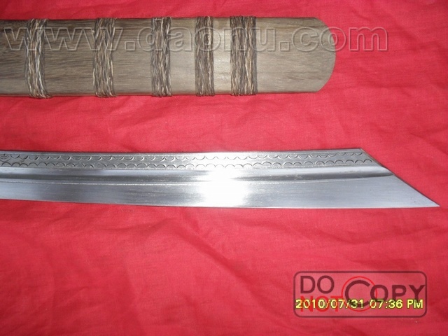 刀背厚:8毫米产品介绍: 此刀由户撒一流名匠线乔发全手工打制的精品小型斩马刀,刀身采用汽车弹簧钢板手工锻打淬火,刀身精雕龙凤等花纹,优质楠木刀装,做工精细,淬火独到。可过竹削铁!收藏极品!