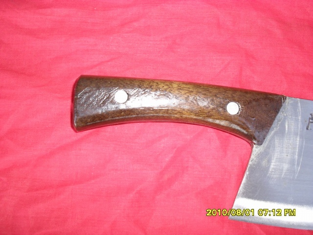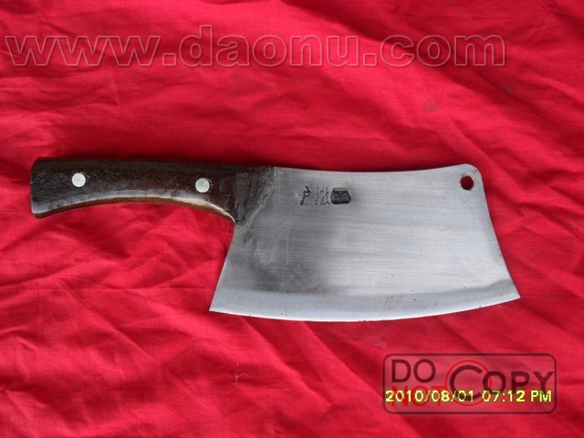 产品名称: 户撒阿昌刀家用砍骨菜刀(户撒名匠李德永亲制) 产品型号: 产品规格: 总长32厘米左右 刃长17厘米左右 产品介绍: 此刀由户撒有名制刀名匠李德永全手工打制的优质家用菜刀,刀身采用汽车弹簧钢板手工锻打淬火,刀柄为耐用牛角把,刃口锋利并且坚硬,可以砍断牛骨鸡肋而不损刃,用这个菜刀切菜下厨砍骨,长期不用磨刀,非市面普通机制菜刀可比。