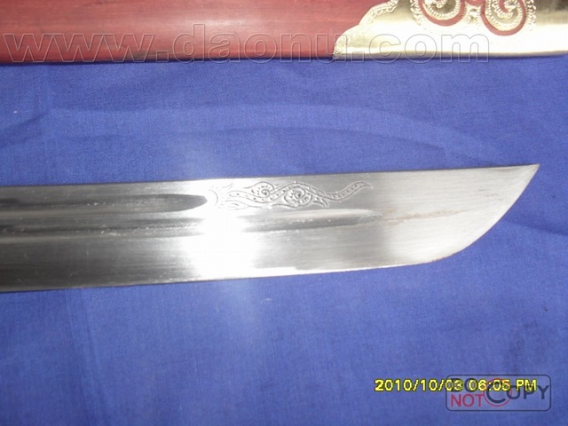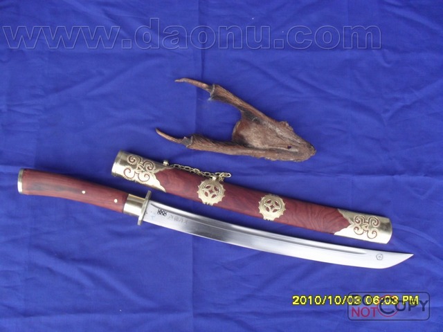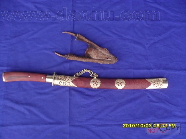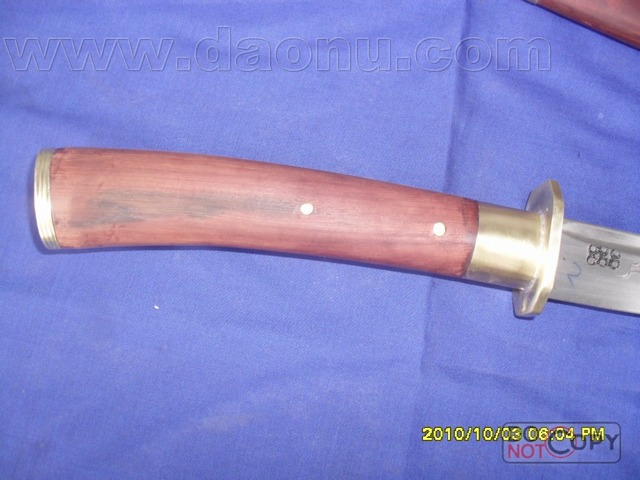 产品介绍: 此刀为户撒刀王项老赛妹夫线乔发亲手精心打制而成,采用汽车弹簧减震板,(刀鞘刀把都采用优质缅甸红木加铜制作);尺寸全长在58CM至65CM间;一面一道血槽,楠木刀壳,可斩角铁钢筋,性能卓绝!此刀为客户要求,根据本站两把刀的优点结合而成,质量极好,具有很高的收藏价值。