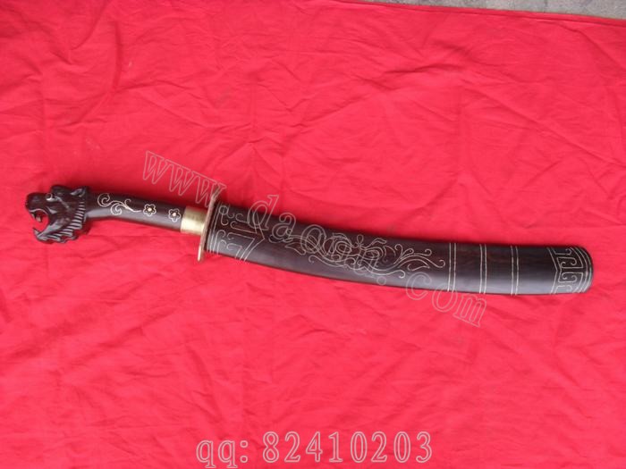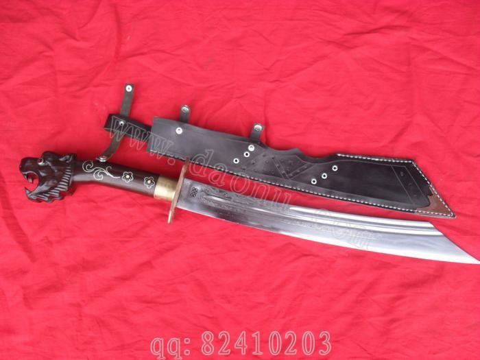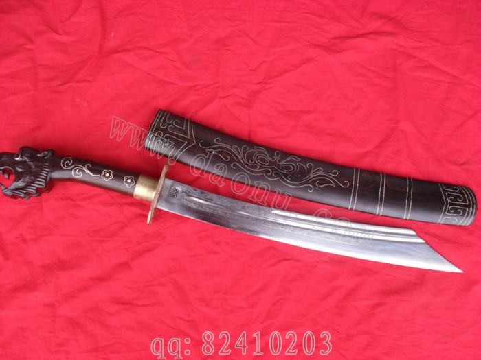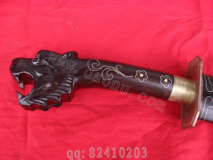 产品介绍: 此刀由户撒名匠线乔发全手工打制的极品乌木斩马刀,刀身采用进口汽车弹簧钢板(又叫高碳锰钢)手工锻打淬火,刀身精雕花纹,此刀经过对上一版极品乌木小砍刀的全面改良,克服了上个版本的所有不足之处,整刀结构更为合理,挥砍有力,使手感方面大大提高,刀把为当地名贵乌木精雕豹头,刀柄手工镶嵌纯银丝,刀鞘也为乌木镶铜丝手工制成,刀刃锋利实用,极具收藏价值,希望大家不要错过。请大家注意,最下面那张图片是皮鞘的,那个刀为庆祝中华手工刀网独家推出的户撒刀首把改良乌木砍刀,促销价1600即可购买!