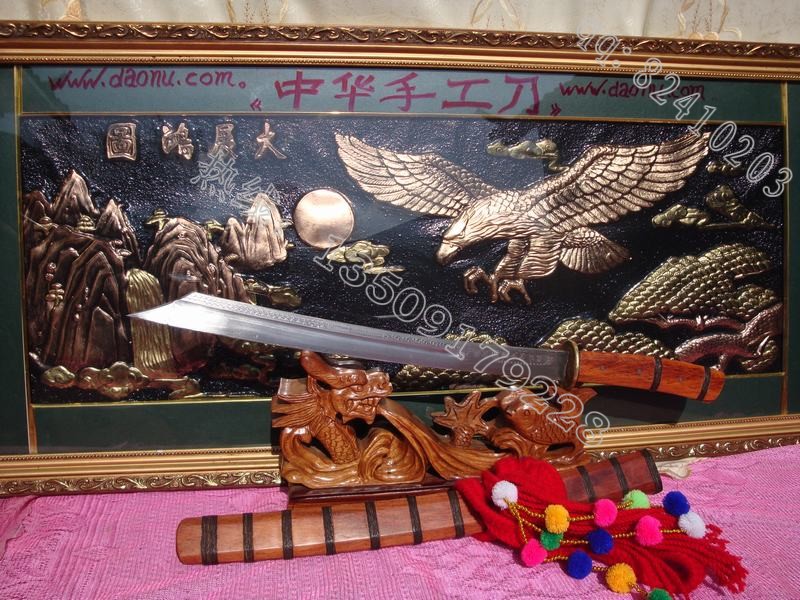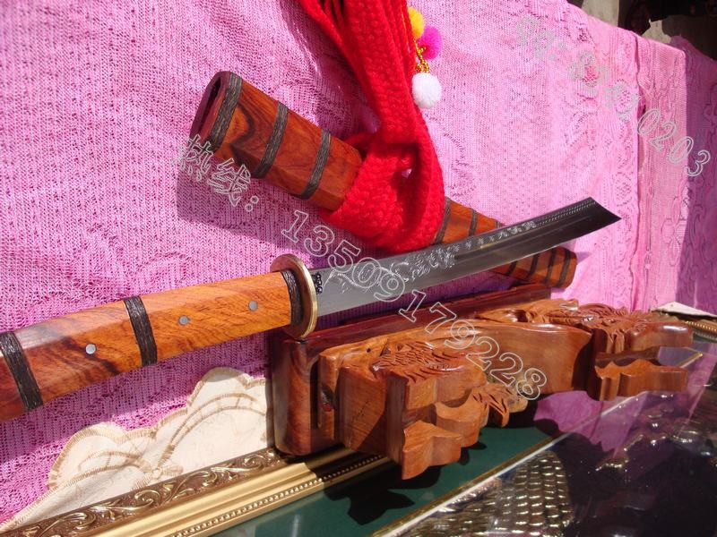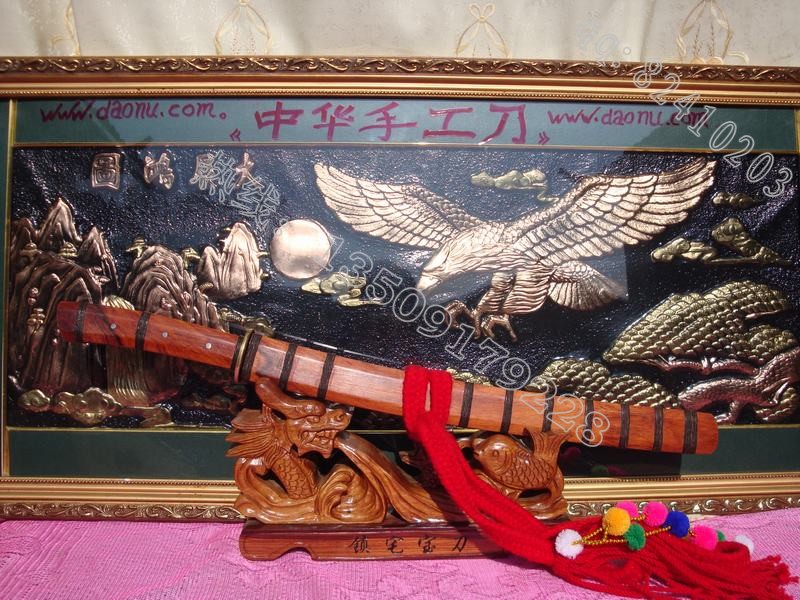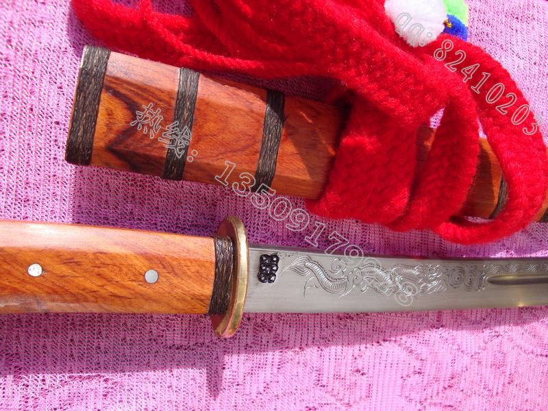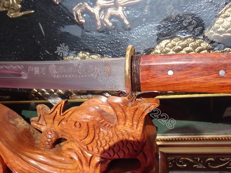 产品介绍: 此刀由户撒刀名匠线乔发精心纯手工打制而成,刀条为高锰碳钢,多道淬火工艺而成,并精雕飞龙,栩栩如生。此刀刀型流畅,刀刃刃口锋利砍铁不伤,实属户撒极品刀具。刀装为缅甸精品酸枝木(红木中最好的一种木料,油性大,分量重,在北方干旱情况下不开裂,本站极品刀剑都推荐此种木料)极品收藏推荐!