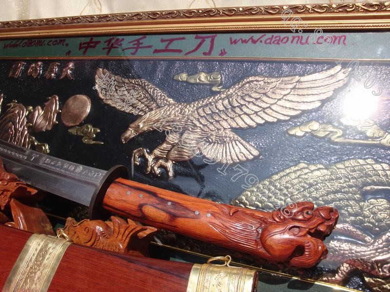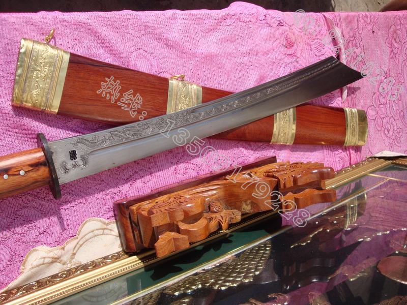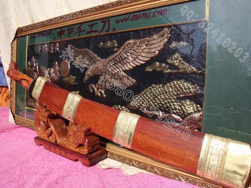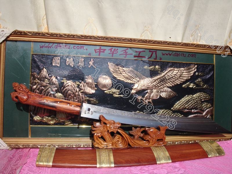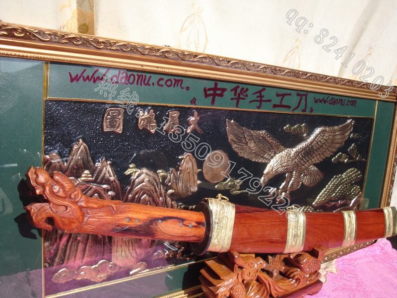 产品介绍: 此刀为本站户撒刀接受订制迄今为止最大、最重、最为霸气的一把顶级斩马刀,此刀采用进口弹簧钢板(也称高锰碳钢或锰65)经本站与签约刀匠户撒名匠线乔发精心设计打制而成,淬火工艺复杂,经过数天的反复锻打、雕花、数道淬火程序下这把户撒斩马之王问世了!此刀刀口坚硬寒光闪闪,可轻松斩断钢筋,刀身雕工细腻如丝,精雕龙凤栩栩如生,宝刀出鞘威势如虹!这把刀装为缅甸精品酸枝木(红木中最好的一种木料,油性大,分量重,在北方干旱情况下不开裂,本站极品刀剑都推荐此种木料)刀鞘包铜精心而成,此刀系乔发精心锻打最大的一把斩马刀,刀条一出即显王者风范!订刀者络绎不绝!喜欢此刀的朋友请迅速订制,付款后立即排队订制,机不可失!购买方法:找到喜欢的作品,请联系客服进行购买,qq:82410203 手机:13509179228 13988247552 旺旺:照雪玉麒麟 ,货款支付方式:新客户推荐淘宝链接支付宝方式,绝对保障客户的利益;老客户可采取银行付款方式(方便我们做银行转账,这是对我们的有力支持,我们对这样可顾客表示感谢)
