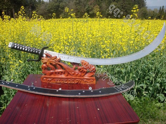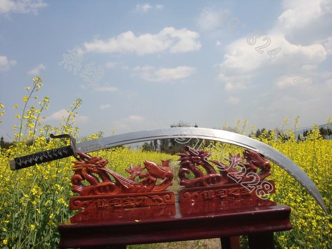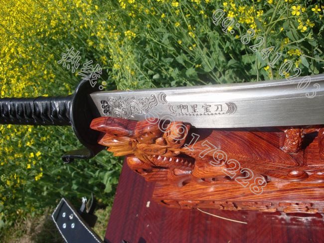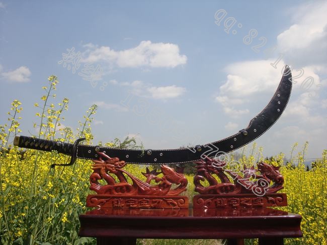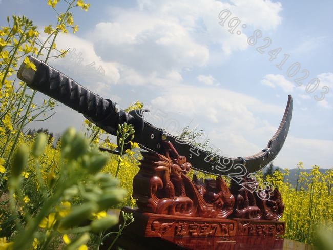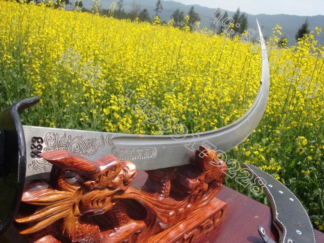 产品规格: 总长121厘米左右(其他数据暂时保密)产品介绍: 本站加强版波斯大弯刀与大家见面了!此刀原型来源于古代波斯,在当时战争中弯刀被大量运用,用这种刀型的刀去作战,威力强大,挥砍震动小,而且此刀型能对敌人产生很大的震慑的作用,刀一出鞘寒光闪闪,让敌人胆寒。!它的威力和外形已经被当地史书所记载。此刀由资深刀友提供样图及规格,是前面大弯刀的改进加强版,由我们中华手工刀网联合户撒名匠线乔发倾心打制而成,采用精选优质弹簧钢打造,刀条、刀型经名匠乔发仔细推敲并做了适当改造精心制作,同样在刀匠的挥汗如雨中,这把让人不寒而栗,威力超群的的极品波斯大弯刀出世了!此刀寒光闪闪,砍铁不伤,刀刃雕工细腻如丝,精雕龙凤栩栩如生,如果在古代这把刀的杀伤力是非常强的,刀柄纯钢和刀身是一体,结实异常,护手独家设计手工制成,再怎么挥砍也不会有任何意外!走过路过不要错过!收藏极品! (此刀应客户特殊要求因而不标出实体价格,和具体规格,如有喜欢的客户请来电咨询)