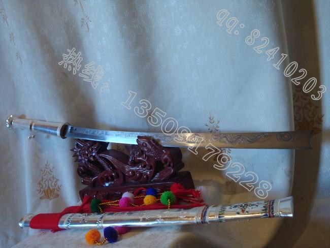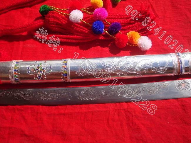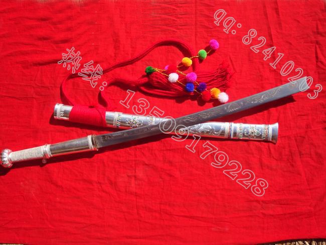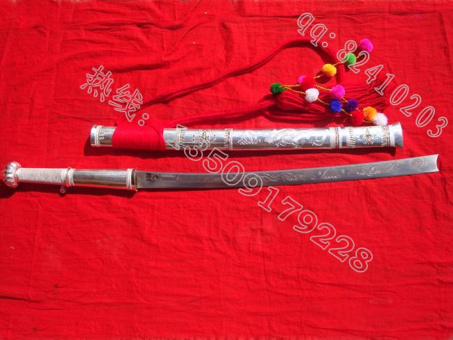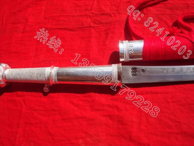 户撒刀王(阿昌刀)纯银刀:此刀是户撒传统的刀式,也是阿昌、景颇、傣等民族最喜爱的一种刀式,每逢节日或家有喜事成年男子都要佩戴,以示庆贺;因做工精细,外观精美,现已成为馈赠与收藏的贵重民族手工艺品,市场价格高昂。鉴赏要点:此刀纯银刀装,刀装采用99纯银皮手工雕刻制作,刀鞘用银完全不计工本,包厚银(大家注意此刀装上雕龙,如果银用的少了那条龙是没法雕的)刀条采用乔发精选瘫痪钢打制而成,刀条采用的是比户撒普通银刀宽1公分左右的背刀刀条(非户撒普通银刀,普通银刀刀条宽度仅为3厘米左右),刃口坚硬,可砍铁过竹,刀鞘手感沉重,市场价格高仰,(比赛收藏级可砍铁过竹)