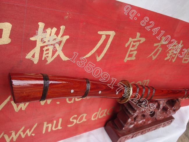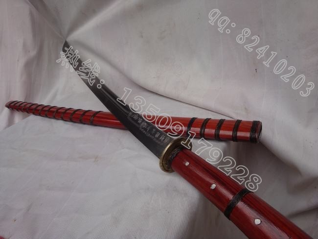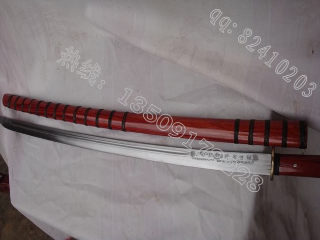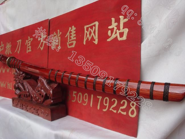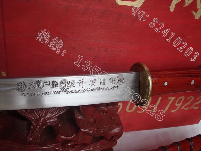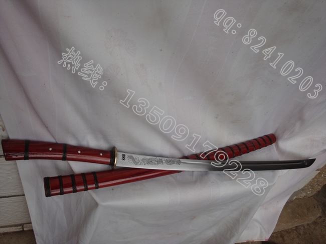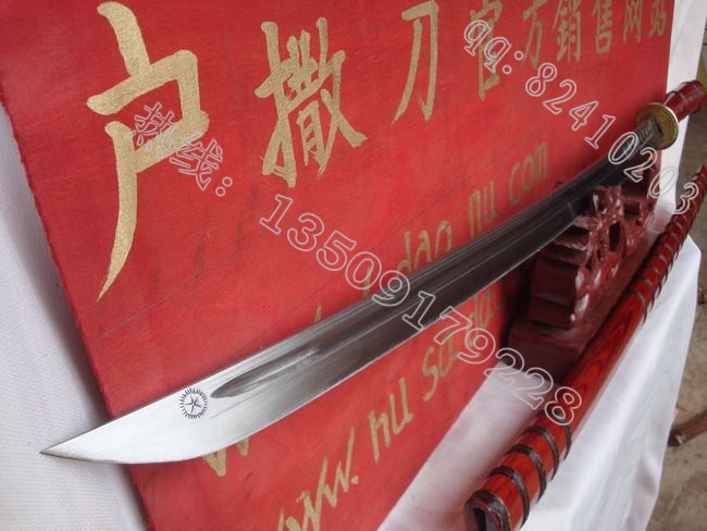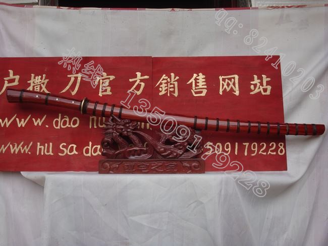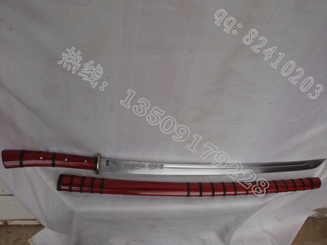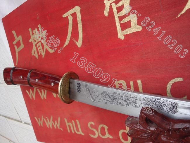 户撒刀品绍: 加长精钢马刀!此刀由中华手工刀网联合户撒名匠线乔发倾心打制而成,钢材采用精挑弹簧钢制成(也称高锰碳钢,我们站现今大部分刀条都是用这种钢材打制而成),刀条、刀型经名匠乔发仔细推敲精心制作,属于特质加强版,此刀超长刀型寒光闪闪,砍铁不伤,刀刃雕工细腻如丝,精雕龙凤栩栩如生,如果在古代这把刀的杀伤力是非常强的,刀柄采用优质百年大叶紫檀缠综丝手工制成,刀芯超长龙骨内包非常结实,再怎么挥砍也不会有任何意外!走过路过不要错过!收藏极品!联系电话:13988247552 13509179228 qq:82410203