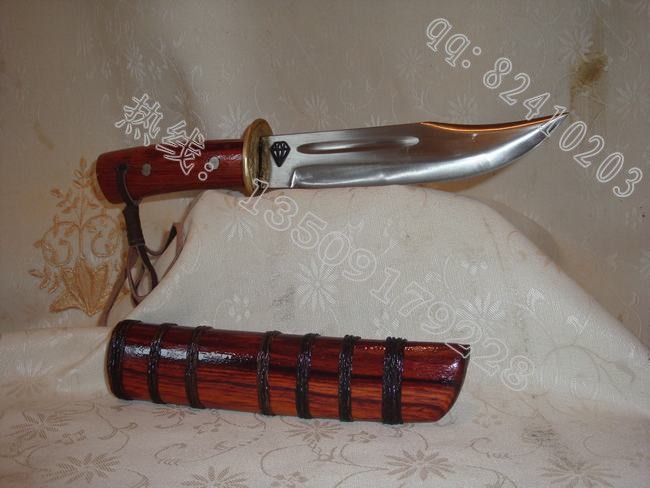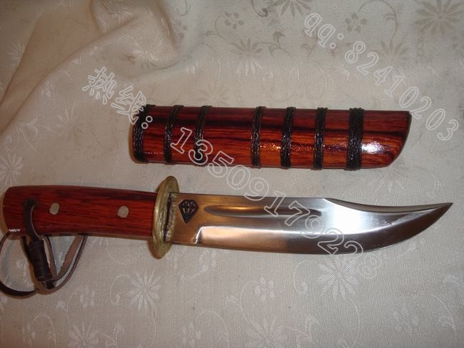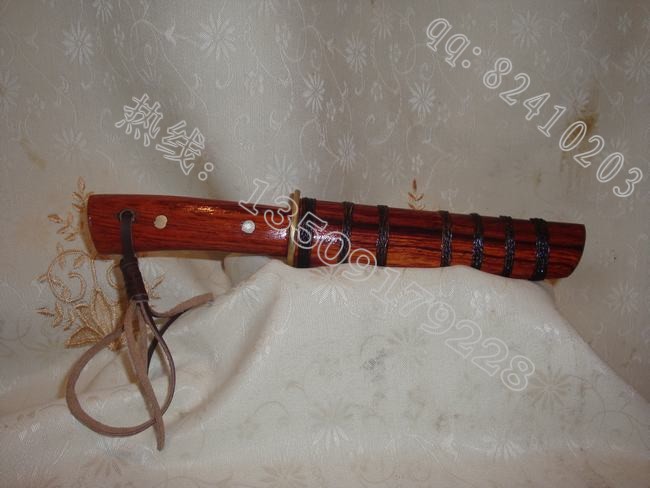 作品介绍: 此极品小猎刀是户撒名匠黎有兴用本站独家提供的高档进口钢材反复锻打特殊方法及配方淬火而成,此刀刃口非常锋利,可刮毛,刃口坚硬,在非常锋利的同时可削铁,此刀刀型流畅经典,因采用特供钢材打制,其防锈力和硬度指标都相比其他材质的户撒刀有较大提高。刀装采用高档缅甸红酸枝,刀柄带牛皮绳。套住手腕可防止脱手。此刀一出深得大家喜爱,其长短适合放在家里或车内防身实用。大家加紧下单订购。