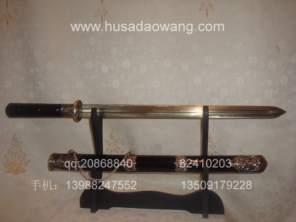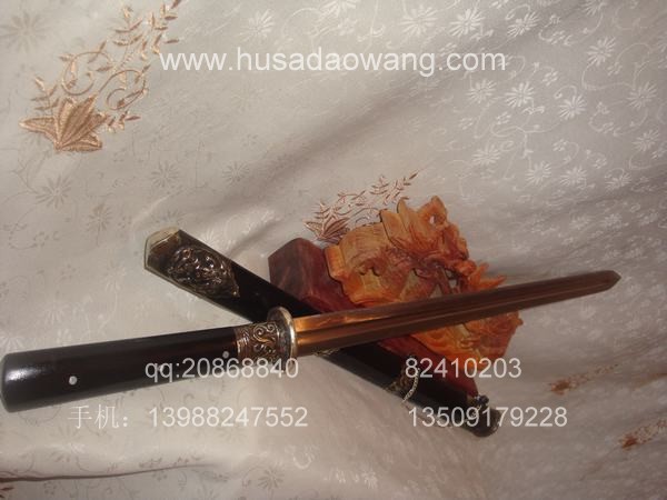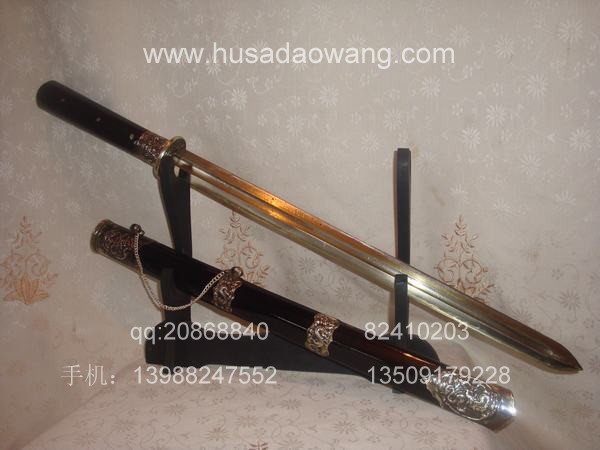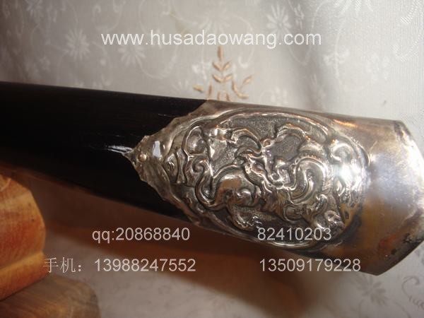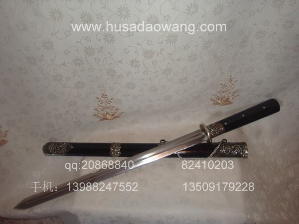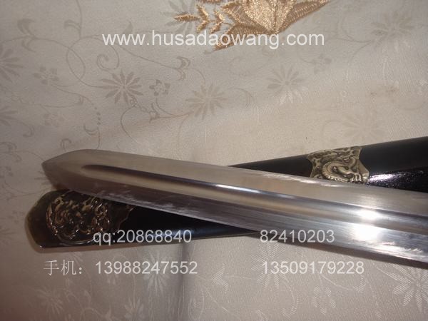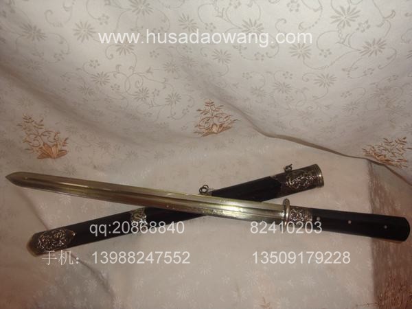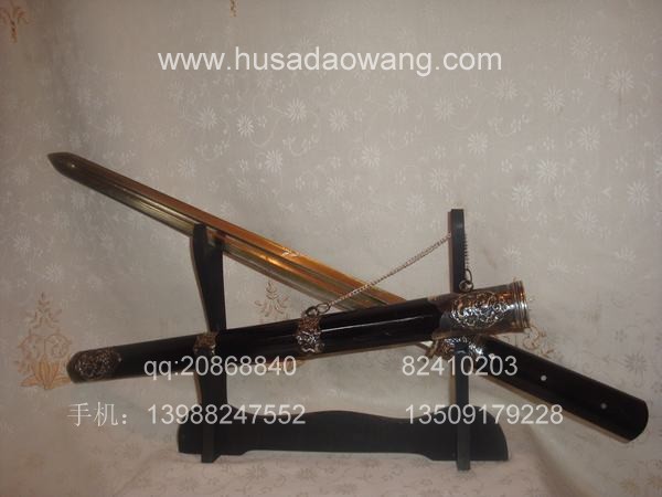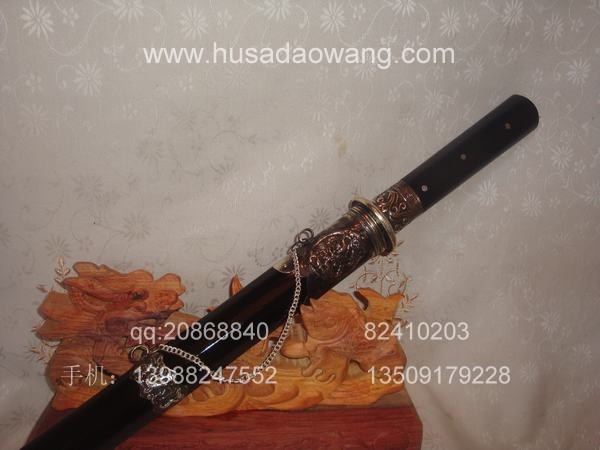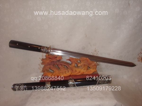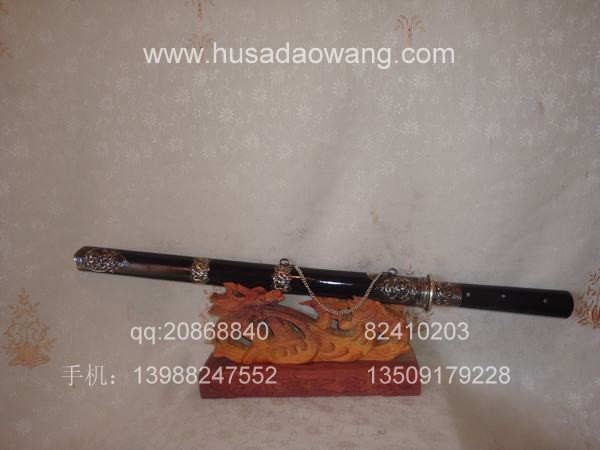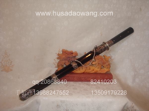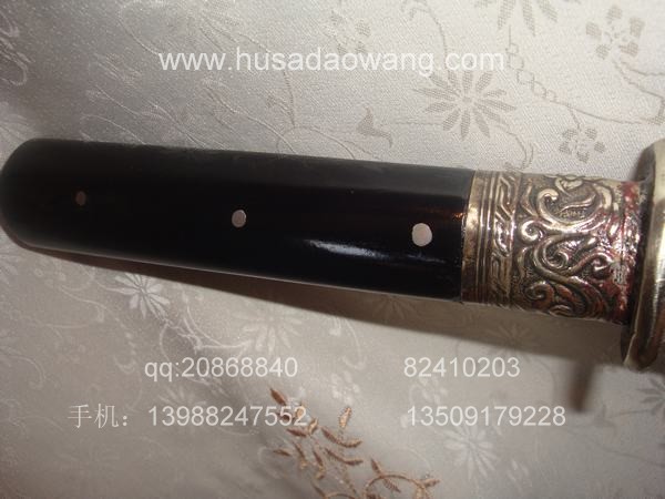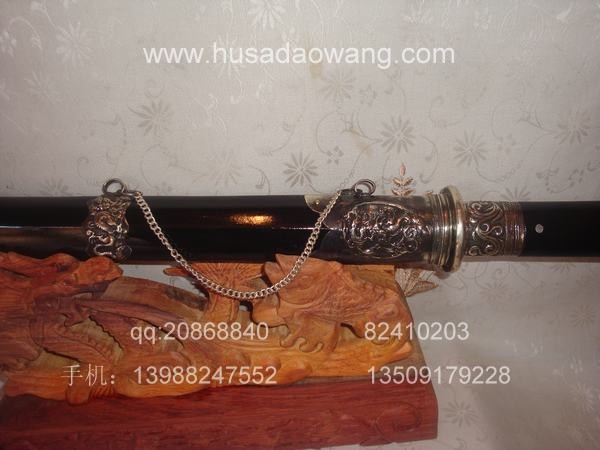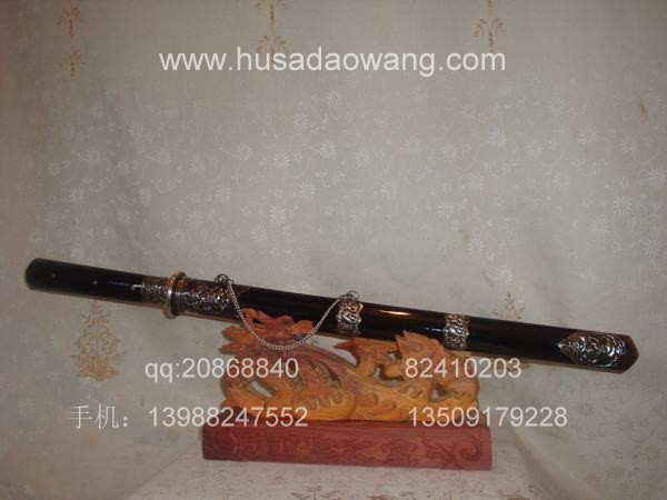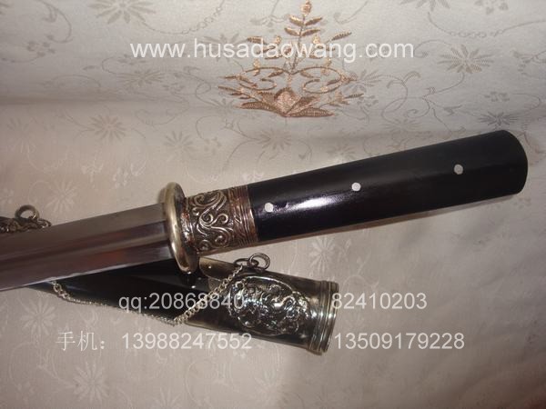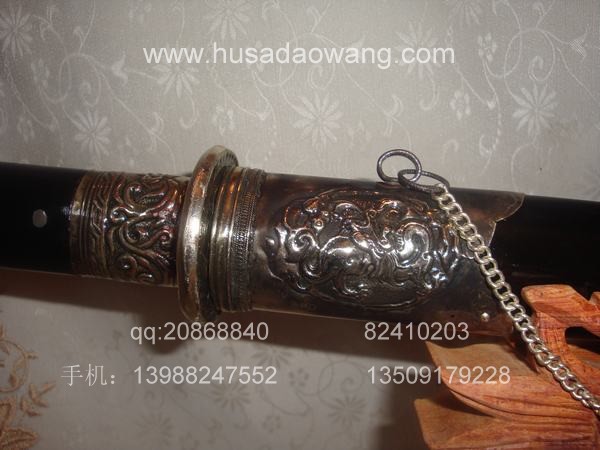 作品介绍: 此剑为户撒当今宝剑之极品系列,经户撒名匠黎有兴采用本站独家进口的特殊钢材精心打制而成,并配以秘制淬火成分,否则淬火很难达到火候。这种钢材锻打难度极高,经过不断实践反复锻打,刃口数次特殊方法淬火,此剑横空出世,宝剑做工细腻,线条流畅,刃口硬度极高,反复淬火回火后刃口达到刮毛还能砍断铁丝的境界,刀身防锈能力也大大超过户撒当地的高弹锰钢系列,收藏价值也进一步提高。此剑剑鞘采用名贵乌木外包缅银,此刀刀装也是一个亮点,整体包优质缅银,刀装师傅也是户撒最好的师傅,使整刀显王者风范!收藏极品,不可多得。观看此剑测试视频:http://www.daonu.com/article.php?id=92