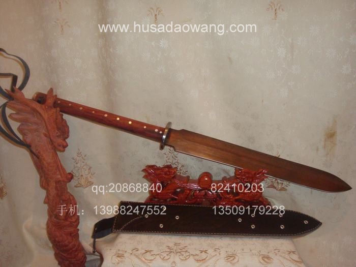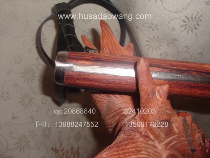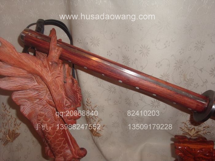 产品介绍: 此剑为户撒刀名匠线乔发全手工精心打制,剑条采用中华手工刀网独家提供的优质花纹钢,剑身独特,乔发千锤百炼又经过多次秘方淬火而成,刃口前端过竹后端砍铁,整个结构为全龙骨,刀身打多个铆钉,刀柄夹优质酸枝木,再大力挥砍也不会出现任何松动,其威力强大可想而知,可砍、可刺,可砸(剑柄最底部加固钢板)客户收到此剑后出乎意料的做了砍钢缆的测试,这个还是不推荐大家做此测试的,钢缆的硬度比钢筋还硬很多!刀可不是用来做这个的哦,呵呵。此剑无需多言,大家来评!客户收到此剑后发来的自己拍的测试视频,http://www.daonu.com/article.php?id=94 特此感谢!