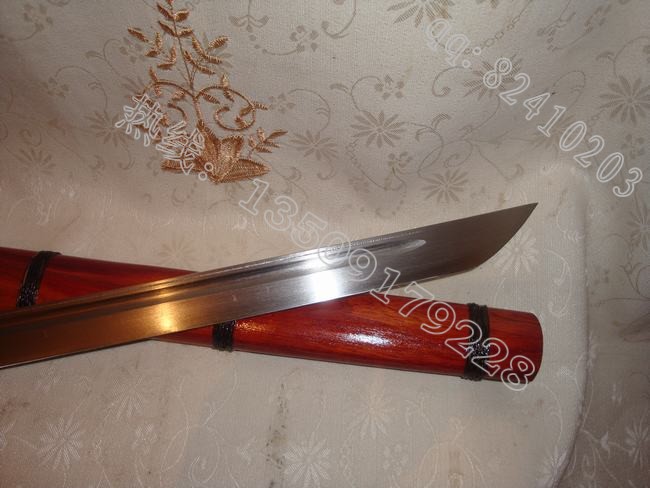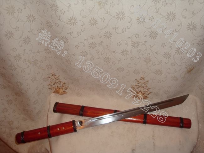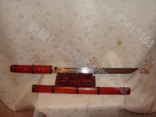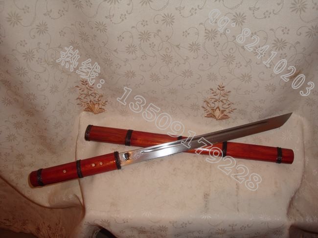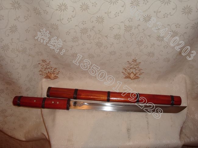 产品介绍: 此刀由户撒刀名匠线乔发全手工打制的精品酸枝木小棍刀,刀身采用精选汽车弹簧钢板手工锻打淬火,刀身精雕花纹,刀刃坚硬锋利,可刮汗毛,刀条流线型设计,流畅美观。刀装极品酸枝木传统工艺精做而成,刀鞘刀柄缠绕传统综丝,以使刀鞘更加结实耐用,民族风格浓郁,收藏精品!