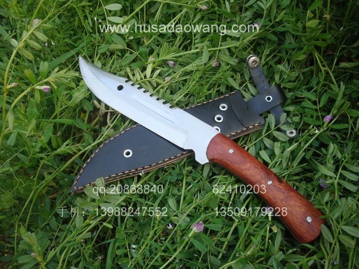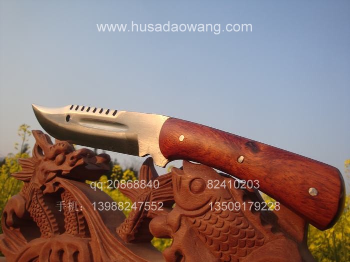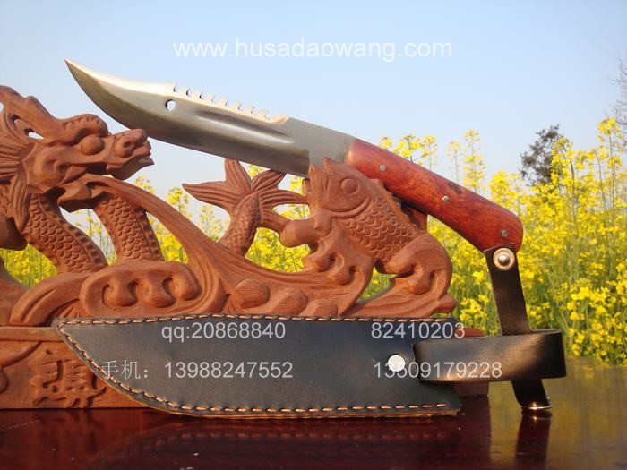产品介绍: 此刀由户撒刀优秀匠人全手工打制的精品酸枝木猎刀,刀身采用精选进口汽车弹簧钢板全手工锻打淬火,刀身漂亮美观,锋利可要求刮汗毛,刀条流线型设计,刀柄为全龙骨外夹优质红酸枝木料,因此结实耐用,手感一流。刀鞘采用纯牛皮双层手工缝制,方便携带,此刀为野营户外用刀人士的最爱。此刀刀条我们一次让匠人打了很多,所以低价促销,大家抓紧时机。