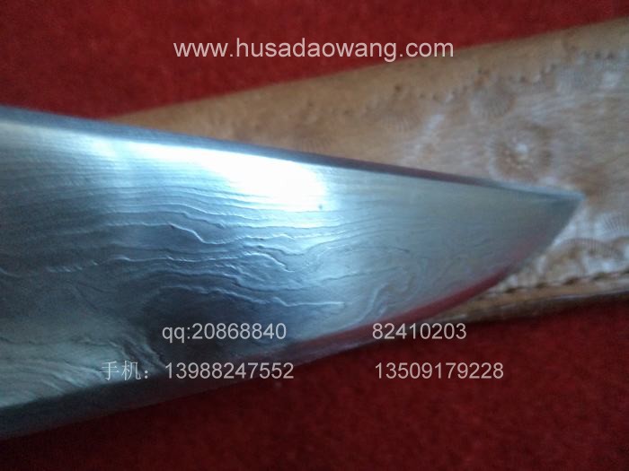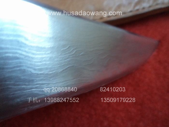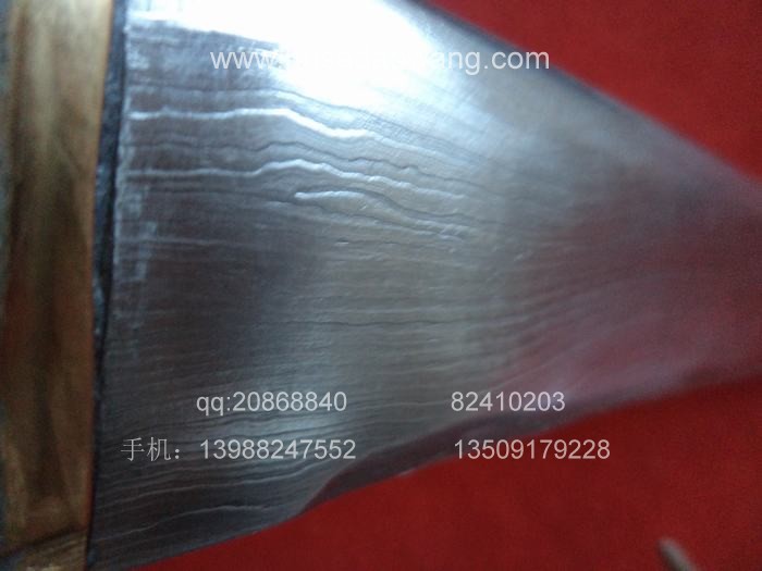 景颇流花刀规格: 全长59厘米左右 刀长58 刀柄13.5 宽4.4 厚0.8景颇流花刀介绍: 此刀由户撒极具勤奋和天赋的工匠江齐精心打制而成,整个打刀工艺及钢材选用,历时三年研制过程,投入大量人力财力,期间他认真学习各家所长,对钢材结构进行了深入的学些和探索,终于全手工冶炼锻打的流花刀得以和大家见面了!此种刀应完全区别于市面上机制花纹钢,此刀手工传统折花技艺,手工折打浪波回旋纹路(绝非成品花纹钢),生动活泼,纹路多变,富有动感;刀柄为珍惜红豆杉木料经手工雕刻有表面防滑凹凸,刀鞘为优质牛皮手工缝制。独门双次淬火技艺,锋利过竹。此刀为美国华侨定制已收藏。大家可继续定制,工期30-40天。