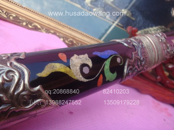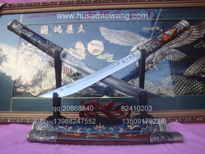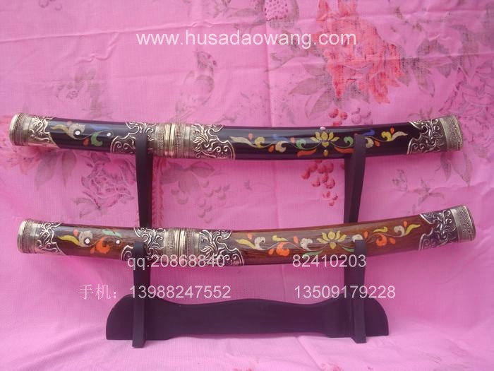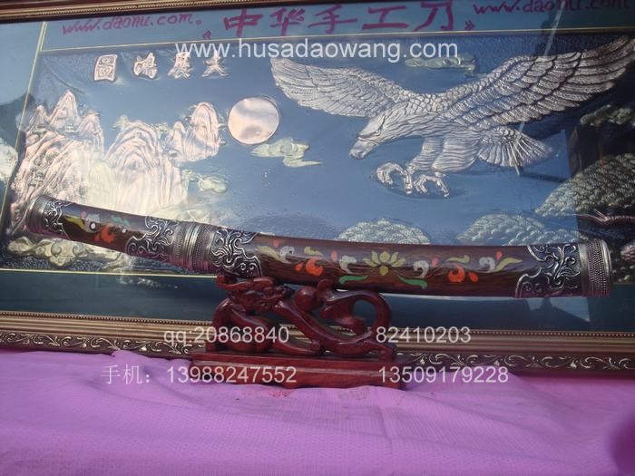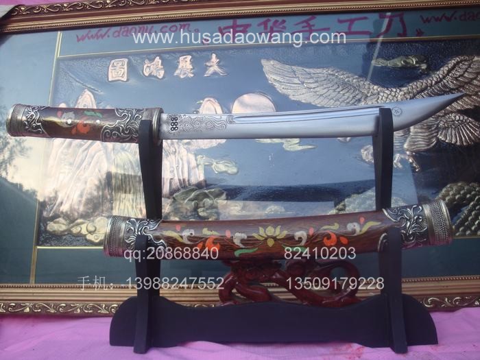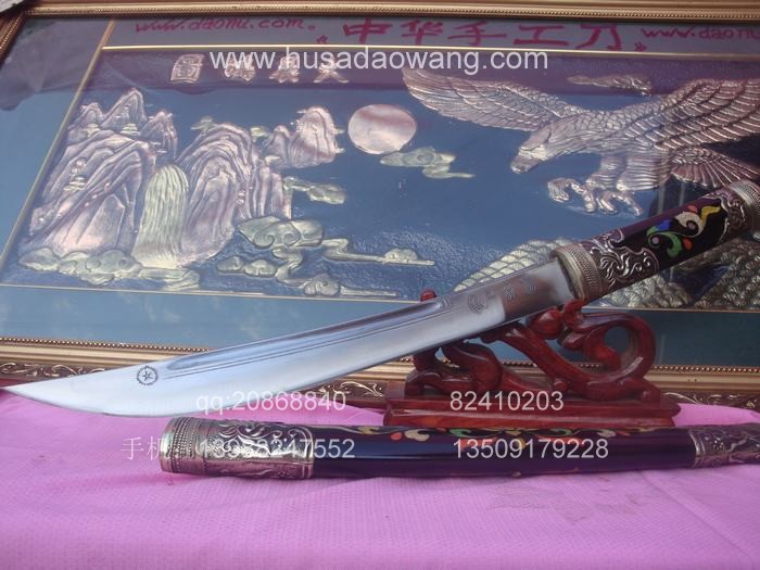 产品介绍: 此宝刀为户撒刀锻打工艺迪派传人线乔发全手工精心反复锻打,苗刀刀身采用优质进口汽车弹簧板或军用车弹簧甲板,传统锻打并配以民族手工雕花工艺,刀身千锤百炼后油淬水淬复杂热处理而成,刀身为传统民族苗刀款型,刀刃流畅古典,配重到位,刀身乔发亲自雕花,民族风味独特,粗锋可砍铁丝,细锋可轻松刮毛,刀柄刀鞘为进口缅甸珍稀黑檀木货优质进口鸡翅木,此刀另一亮点为刀鞘上镶有色彩缤纷的花色,此工艺并非染色,而是采用珍贵动物骨粉配以特殊配方镶嵌而成,非普通印花,独特华贵,为古代贵族佩刀工艺。此刀深得各位民族工艺爱好者青睐,请大家抓紧机会收藏。