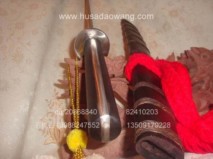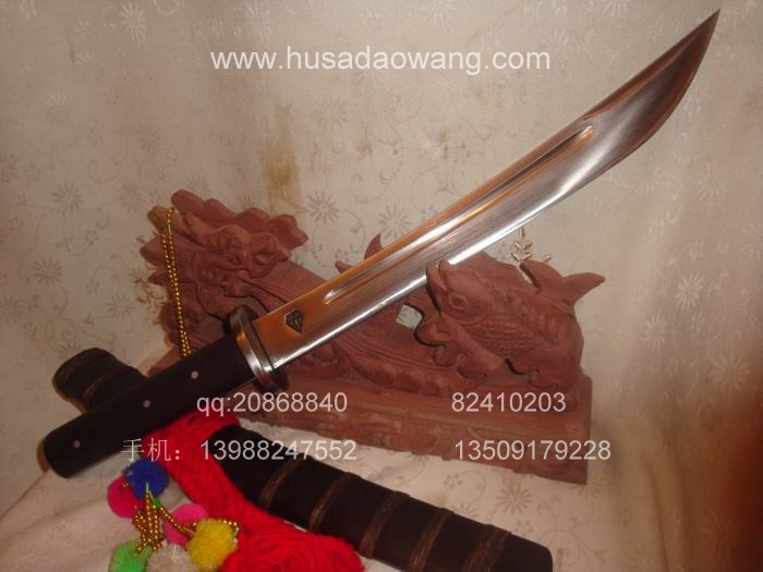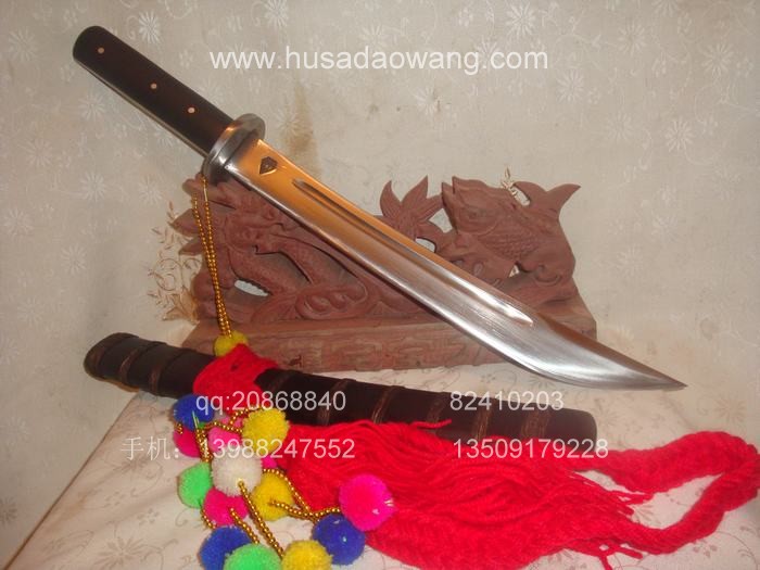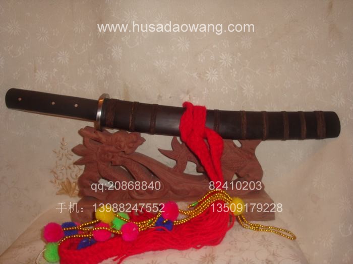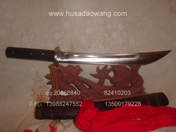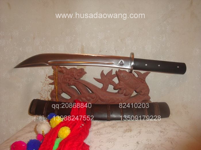 宝刀介绍: 此刀为户撒当今最顶级钢材打制的极品小苗刀,经户撒优秀刀匠线兴过(打刀工艺极其高超,乔发也伸大拇指赞赏,尤其对我们独家高档进口钢材的锻造拿捏少有的到位)采用本站独家进口的特殊钢材精心反复锻打而成,这种钢材锻打难度极高,经过匠人反复摸索,反复锻打,刃口数次特殊方法淬火,小苗刀问世,此刀做工细腻,线条流畅之极,刀身采用整个一体的全龙骨设计,其结实耐用程度更为提高!此刀刃口硬度极高,可在保持比较锋利的情况下砍铁不伤,刀身防锈能力也大大超过户撒当地的弹簧钢系列,因此具有更好的收藏价值。这把刀装为高档进口黑檀木,纹理细密结实耐用,刀柄刀鞘整体包扎严密扎实,手感一流。收藏极品,不可多得。购买方法:在网站找到喜欢的作品,或自己出图订做都请联系客服进行购买,qq:82410203 手机:13988247552 13509179228 旺旺:照雪玉麒麟 ,货款支付方式:新客户推荐淘宝链接支付宝方式,绝对保障客户的利益;老客户可采取银行付款方式(方便我们做银行转账,这是对我们的有力支持,我们对这样可顾客表示感谢)