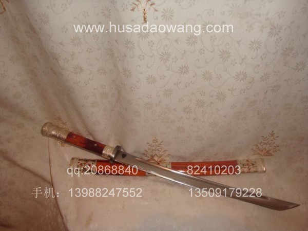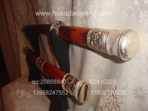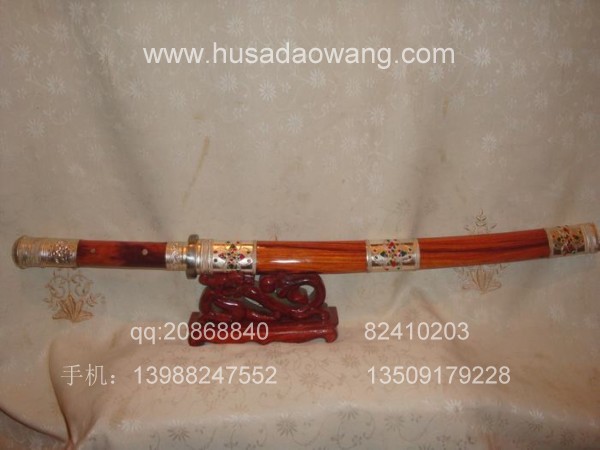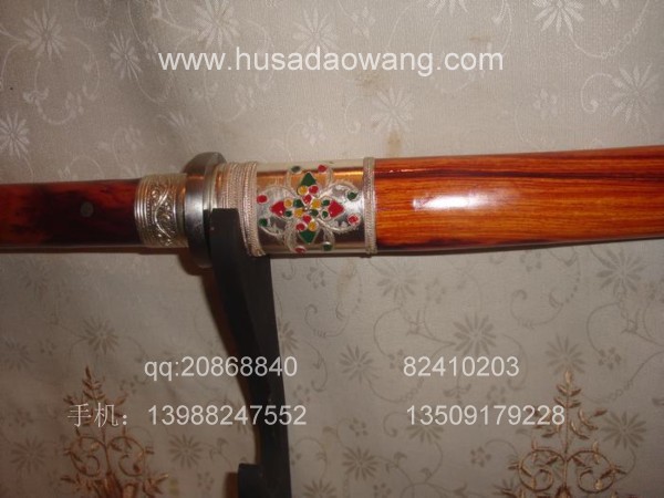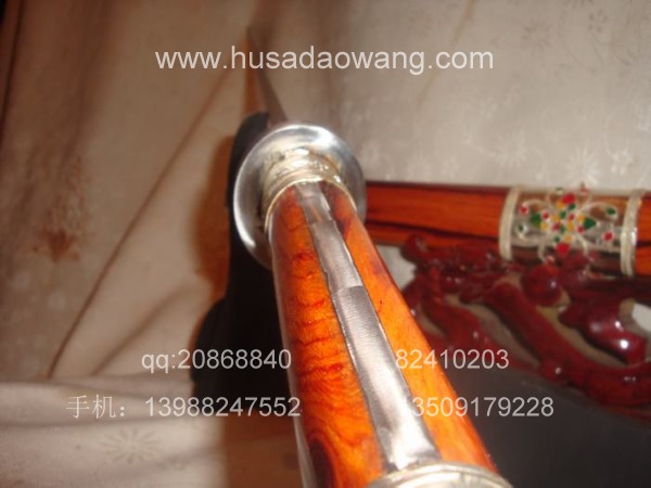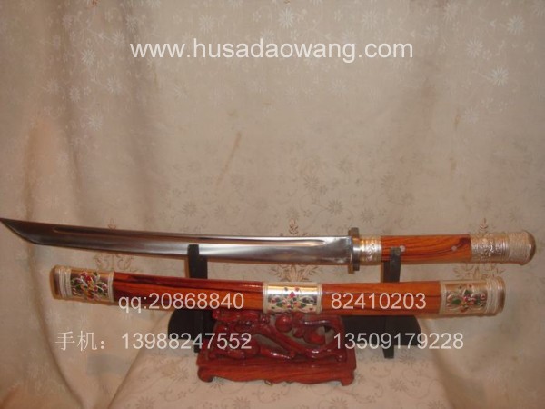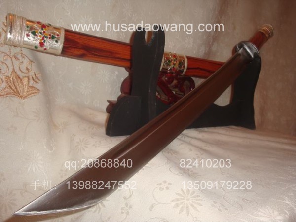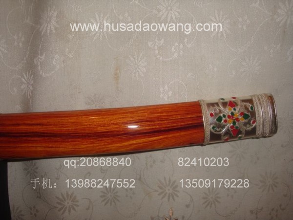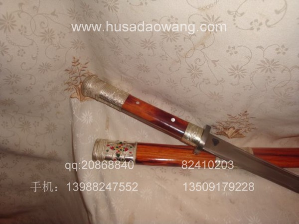 商品介绍: 此刀为户撒顶级钢材及工艺制作的一把经典款式马刀,刀条经户撒名匠黎有兴或线兴过采用本站独家进口的高档钢材采用特殊打法精心打制而成,这种钢材锻打难度极高,对炉火温度要求极高,刃口数次特殊方法淬火,经过匠人超大工作量锻打,刀口硬度极高,可在锋利状况下砍断铁钉(砍钉过程铁钉下面垫硬木墩或者软铁墩,刀口垂直铁钉砍下)而不伤刃口,整刀采用全龙骨设计,刀条一体而成,因此刀身更加结实耐用。此刀身防锈能力也大大超过户撒当地的高弹锰钢系列,收藏价值也进一步提高。此刀在硬度性能方面可比拼国内价格过万的刀具,这把刀装为缅甸精品酸枝木(红木中最好的一种木料,油性大,分量重,在北方干旱情况下不开裂,本站极品刀剑都推荐此种木料)外包缅银,刀装师傅也是户撒最好的师傅,使整刀显王者风范!喜欢习文练武的武术爱好者留意啊,收藏极品,不可多得。购买方法:找到喜欢的作品,请联系客服进行购买,qq:82410203 手机:13988247552 或13509179228 ,货款支付方式:新客户推荐淘宝链接支付宝方式,绝对保障客户的利益;老客户可采取银行付款方式(方便我们做银行转账,这是对我们的有力支持,我们对这样可顾客表示感谢)