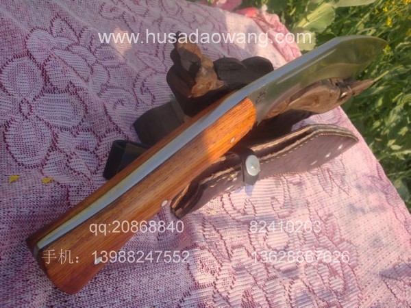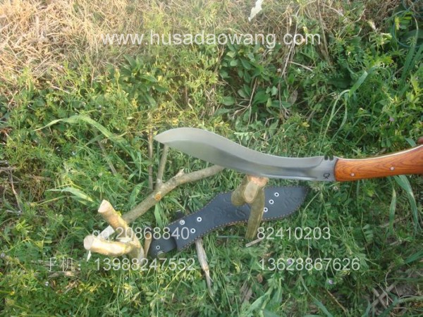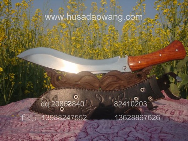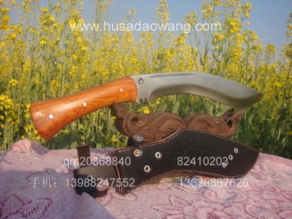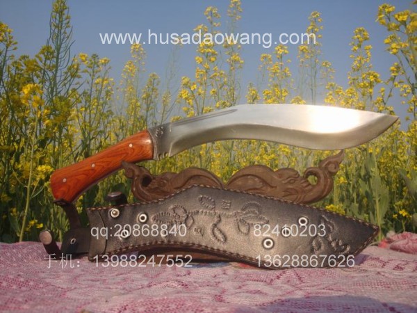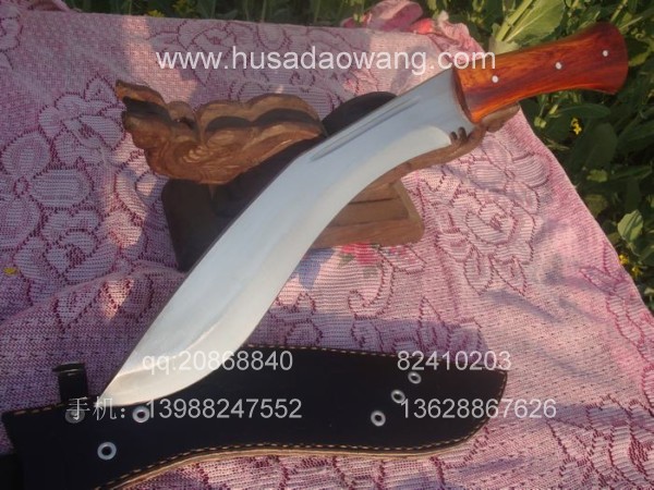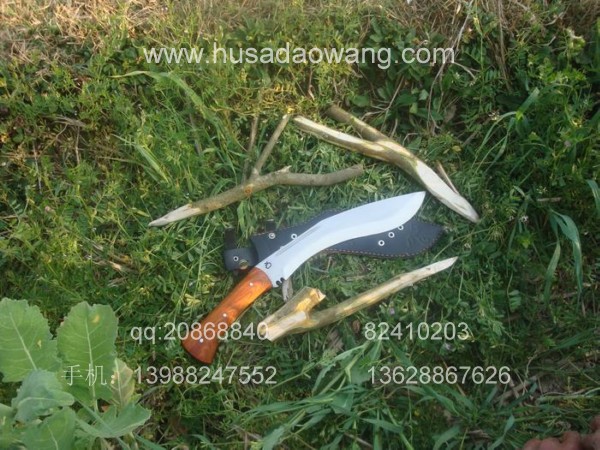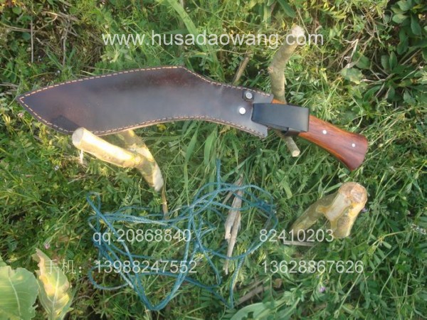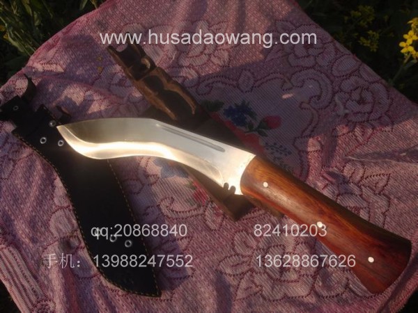 产品介绍: 此刀由户撒优秀刀匠全手工打制的极品尼泊尔弯刀,刀身采用优质军用汽车弹簧钢板手工反复精锻而成,刃口采用户撒传统配发淬火,刃口坚硬锋利,刀的设计完全采用尼泊尔弯刀的标准形状,并局部改进,刀柄采用了最为结实耐用的全龙骨设计,刀柄尾端加大,大力挥砍不会脱手。此刀劈砍有力手感舒适,性能已大大超过了正品尼泊尔弯刀,是广大驴友和户外运动者最钟爱的理想开路刀具。此刀刀鞘采用本站独家定制的双层纯牛皮,非常结实耐用。户外运动者的不二选择。