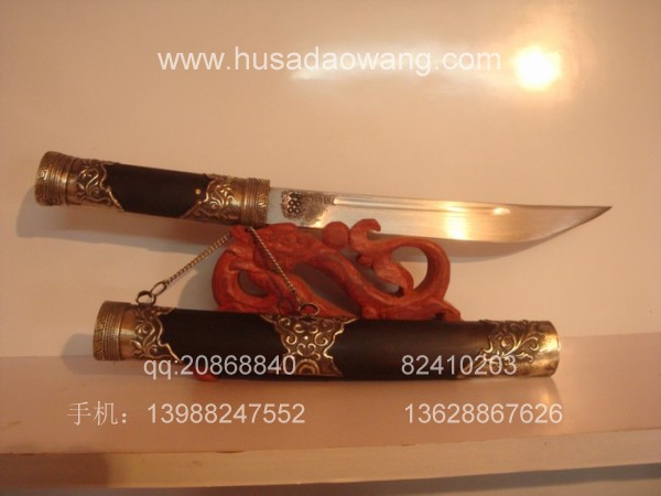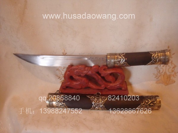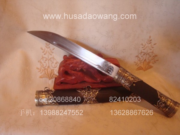 制作工艺:户撒传统手工锻打工艺、秘传水淬油淬热处理工艺、 优质红酸枝、传统刀鞘制作、手工包铜 名匠线乔发