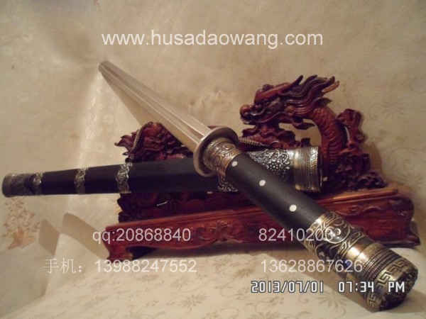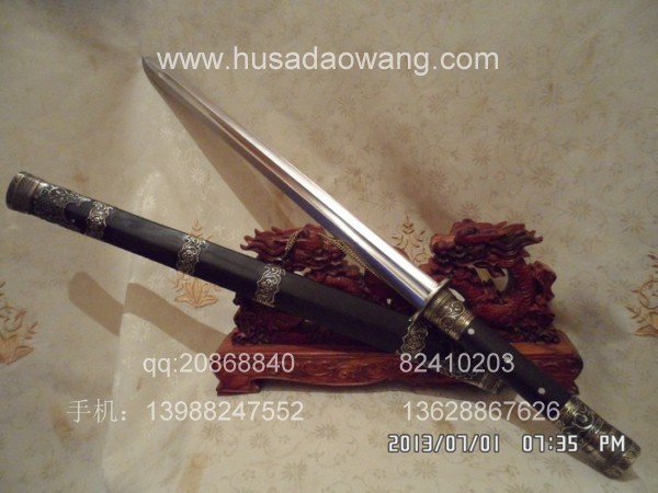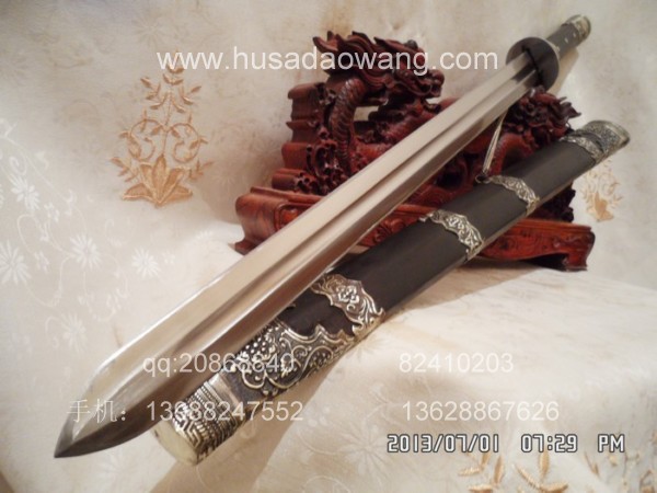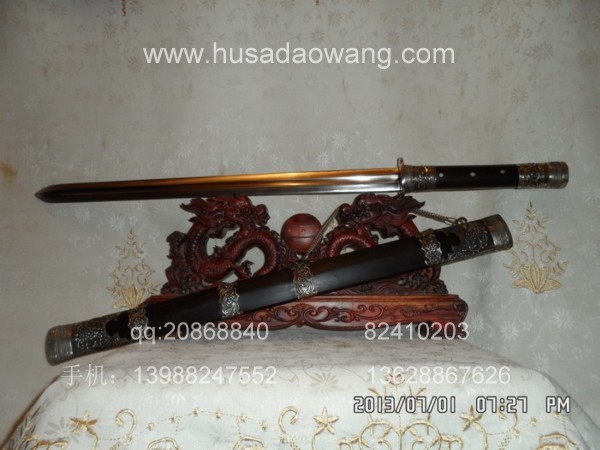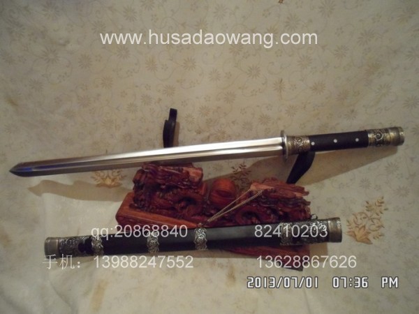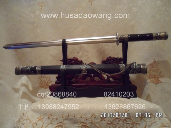 作品介绍: 此剑为户撒当今宝剑之顶级系列,剑条经户撒名匠黎有兴采用本站独家进口的特殊钢材精心纯手工锻打而成,此种钢材锻打难度极高,剑身要经过反复多次锻打,刃口也需数次特殊方法淬火,而后宝剑鼎成,此剑做工扎实,线条流畅,刃口硬度极高,经反复淬火回火后刃口达到刮毛还能砍断铁丝的境界,刀身防锈能力也大大超过户撒当地的高弹锰钢系列,收藏价值也进一步提高。此次制作,比前面制作更为加强,采用全龙骨设计,使得整个宝剑更为结实耐用,剑尾端也进行包缅银处理。此剑剑鞘采用名贵黑檀木外包缅银,此剑装也是一个亮点,整体包优质缅银,剑装师傅也是户撒最好的师傅,使得此剑显王者风范!收藏极品,不可多得。