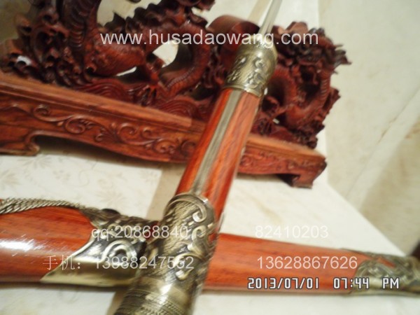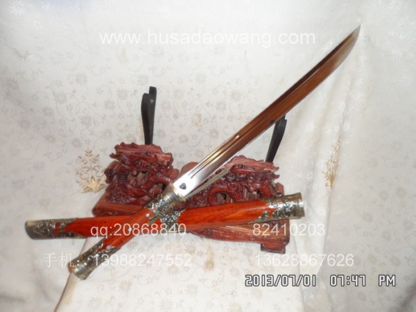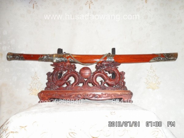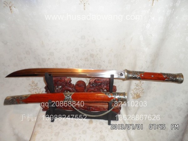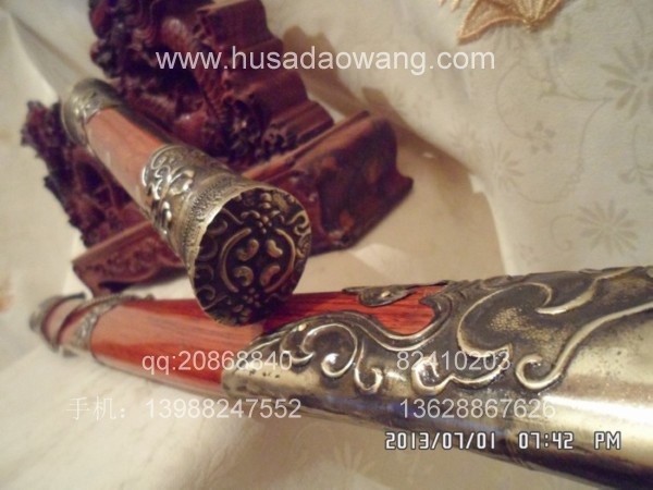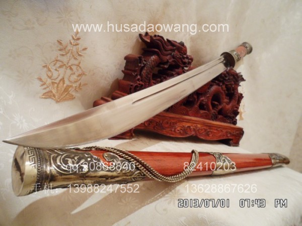 商品介绍: 此刀为户撒刀之极品高档进口钢材系列,刀条由户撒制刀名匠黎有兴采用本站独家进口的特殊钢材千锤百炼精心打制而成,此种钢材锻打难度极高,普通工匠难以打制,刀条必须经过特殊锻打方法长时间反复锻打,刃口再经数次特殊方法淬火,而后宝刀鼎成。宝刀做工扎实,刀型漂亮,流线刀刃,刃口硬度极高,反复淬火回火后刃口达到刮毛还能砍断铁丝的境界,刀身防锈能力也大大超过户撒当地的高弹锰钢系列,因而收藏价值极高。刀柄采用全龙骨设计,使得整个苗刀更为结实耐用,此刀刀鞘采用名贵缅甸红酸枝木外包缅银,整刀彰显王者风范!收藏极品,不可多得。订购从速。