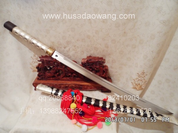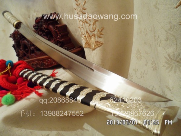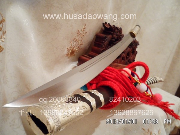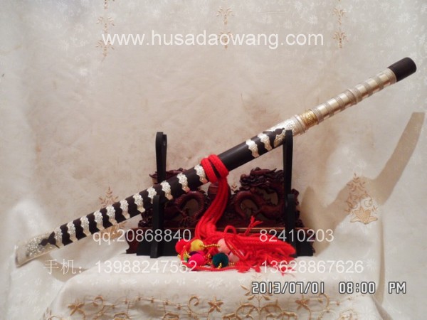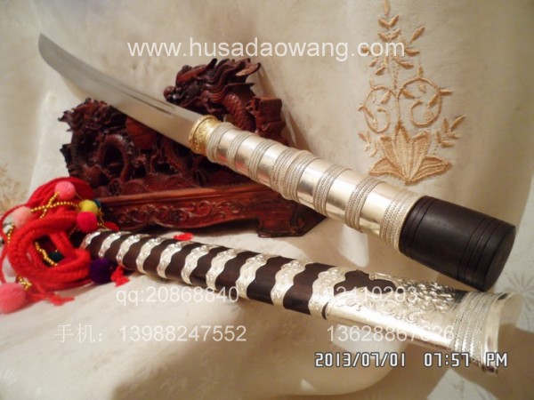 商品介绍: 此刀为被户撒刀制刀第一名匠线乔发全手工精心锻打而成,刀身采用优质军用高碳锰钢,传统锻打方法,刀型为传统苗刀刀型,刃口经千锤百炼后秘方淬火热处理而成,经典苗刀刀型,刀型漂亮,刀刃流畅,刃口淬火硬度高,刀背硬度相对低,以保证刀身刚柔相济,锋利后可轻松过竹,粗锋可砍铁不伤。刀柄刀鞘皆精选天然珍稀黑檀木,老料加工,刀鞘精包缅银,经典民族收藏。请大家抓紧时机定制。