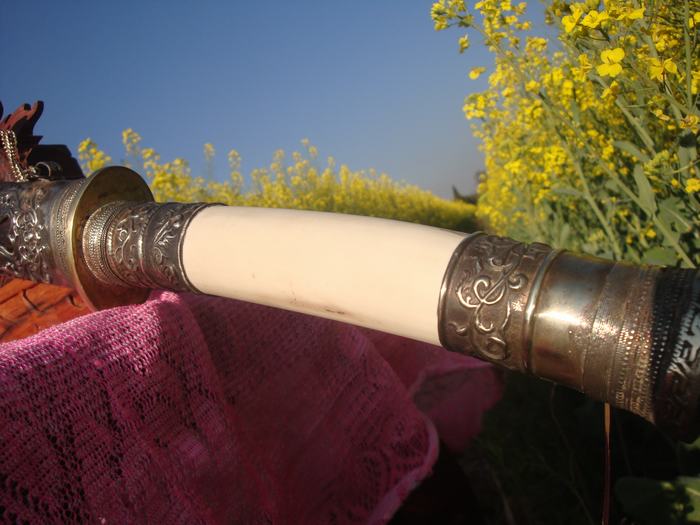 制作工艺:户撒刀名匠线乔发 全手工锻制 珍稀黑酸枝木刀鞘 野生大鹿角刀柄 精包缅银 配方局部淬火 刚柔相济
