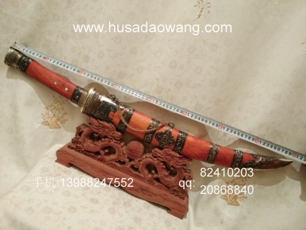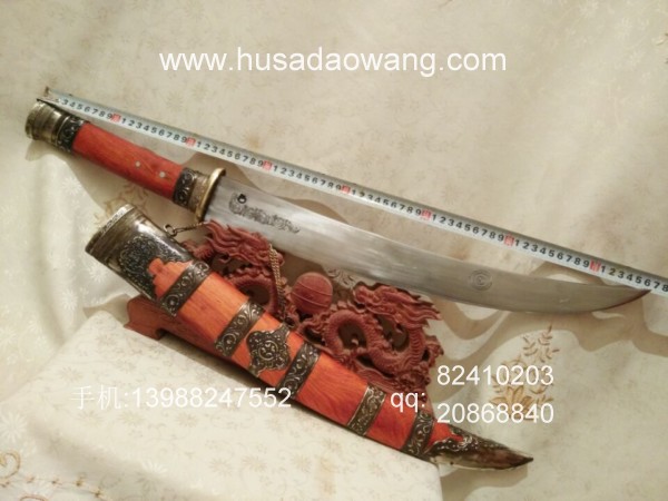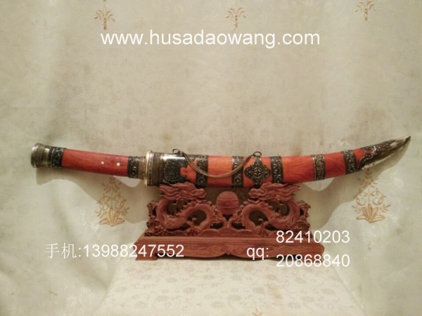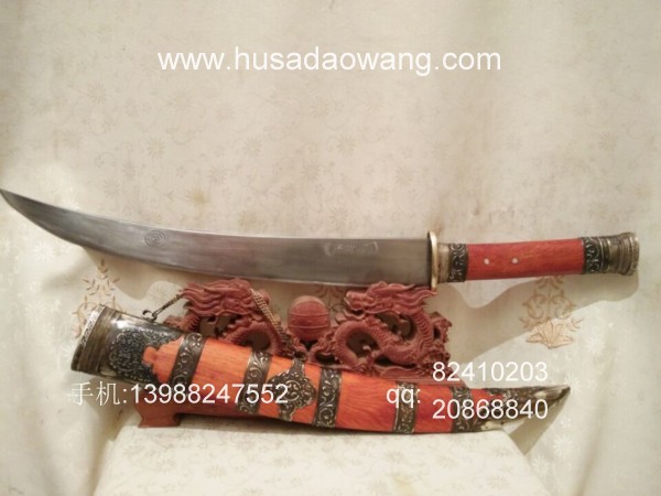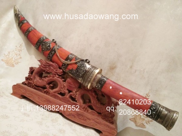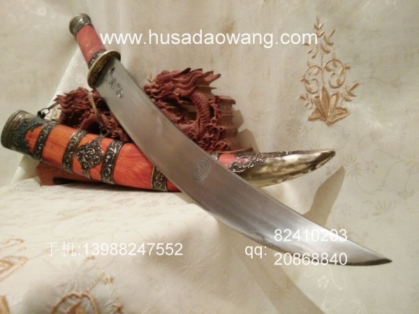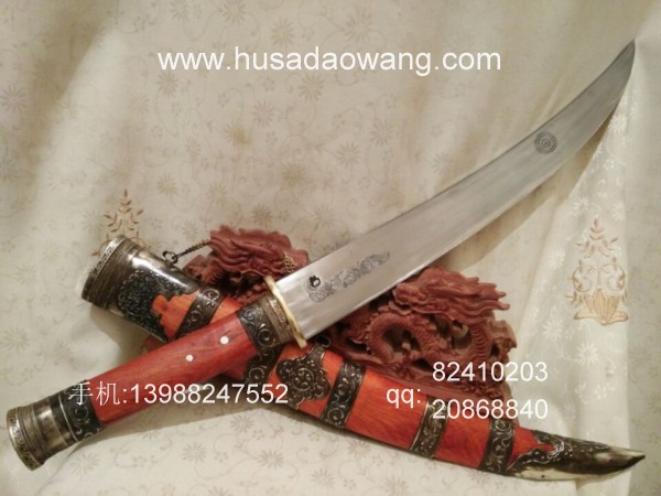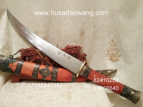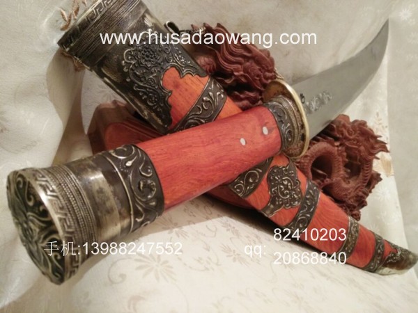 商品介绍: 此刀采用优质高碳锰钢制作,刀条由户撒优秀刀匠采用传统户撒刀锻打工艺锻打而成,此刀原型为正宗古代蒙古骑士佩刀,刀条月牙弧度,劈砍面积增大,骑兵马上做站,挥舞相当有力,威力强大刀!刀型霸气外露,手感出众,挥砍性能卓越,刀条经过匠人千锤百炼后配方淬火而成,刃口锋利坚硬,粗锋轻松砍铁,细锋还可过竹削铁,刀鞘为精选缅甸红酸枝外包缅银!请大家抓紧时间收藏!