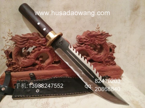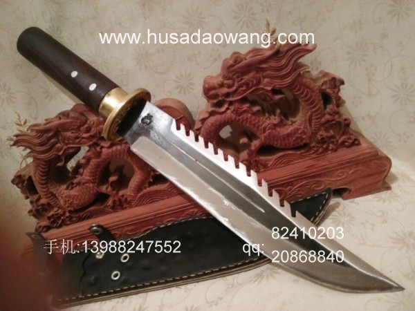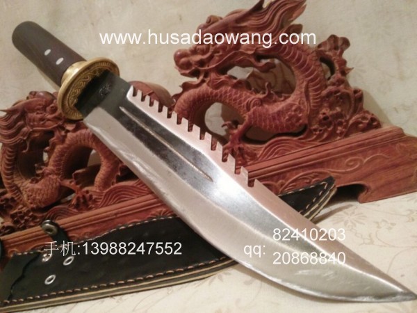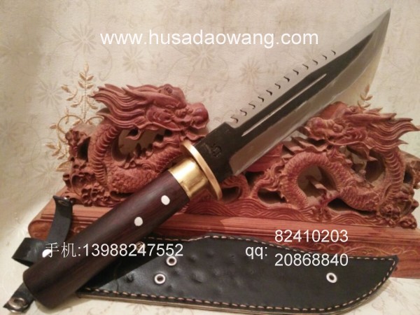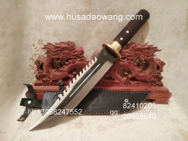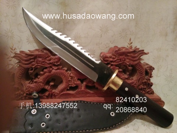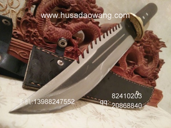 产品介绍: 此刀由本站优秀户撒刀工匠全手工打制的精品兰博丛林刀,原型采用著名国际影视明星史泰龙主演的<第一滴血刀>中的兰博一号丛林刀,此刀身采用精挑军用汽车弹簧钢板全手工反复精锻而成,刃口采用户撒传统配方淬火,刀锋坚硬锋利,粗锋砍铁不伤,细锋的话可达到刮毛效果,刀背带齿,方便对付户外复杂环境,此刀劈砍有力手感舒适,性能手感极好,也是专为广大驴友和户外运动者以及私家车防身使用。此刀刀鞘采用本站独家定制的牛皮内加防潮纸板,非常结实耐用。此刀身黑色部分是煅烧后的自然黑色,如果刀友不喜欢这种黑色,可定制全白版本。