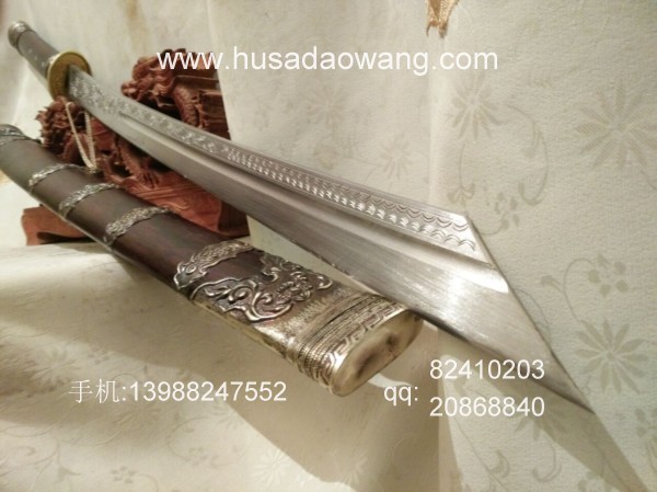 商品介绍:此刀由户撒刀嫡派传人线乔发全手工打制而成,刀型为户撒传统经典斩马刀款式,劈砍强势,因其威力巨大古代战争中也用来砍断马腿之用,斩马刀因此得名。此斩马刀经名匠精心锻造,独特淬火技术,刀刃硬,刀身软,已达到刚柔相济之功。刃口粗锋可砍铁不伤,细锋锋利过竹,性能卓绝,另配以缅甸优质乌酸枝刀柄刀鞘,再外包缅银,彰显宝刀之古朴大气,户撒刀精品!收藏者请抓紧时间定制!
