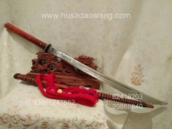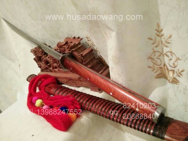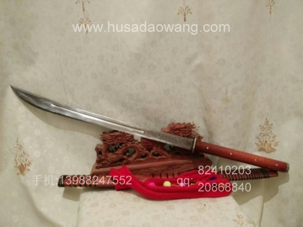 商品说明:本款刀为户撒第一名匠线乔发亲手锻打而成,造型为传统民族苗刀款式,此刀为甩毛巾极度锋利型,因此锻打和磨刀方法都不相同,需要注入极大的精力和技艺,此苗刀造型古朴刀刃流畅,锻打完工后经过独特配方热处理,刃口坚硬,后经过工艺名匠手工冷磨后达到了惊人的锋利!干毛巾搭在刀刃尾端,用力一甩,毛巾凌空而断!刀鞘和刀柄采用缅甸优质红酸枝,防开裂效果极佳,可应对北方寒冷干燥气候,并坚固耐用!刀条一体全龙骨设计,并且尾端加钢垫(独家设计),此刀可作为刀友收藏和把玩使用,它的锋利会给您留下难以磨灭的印象!