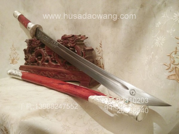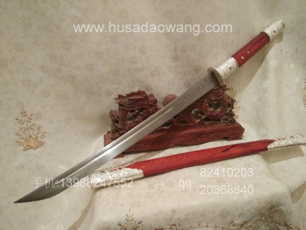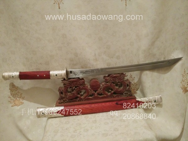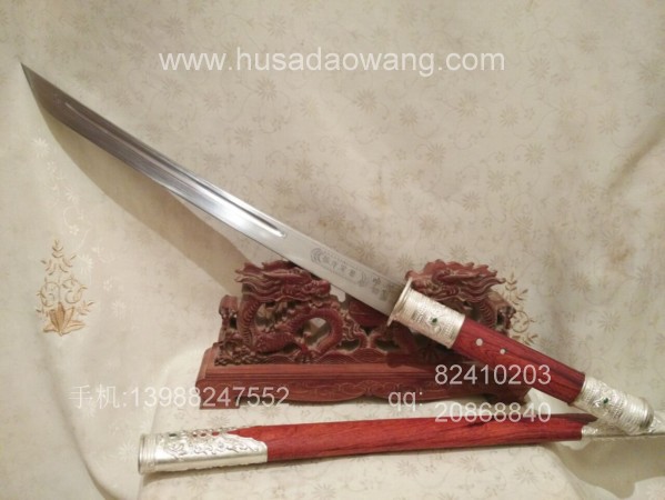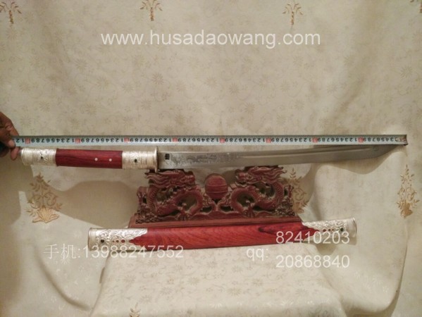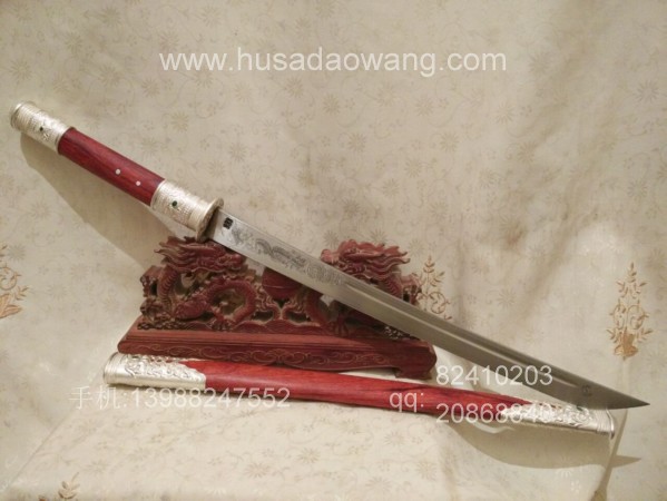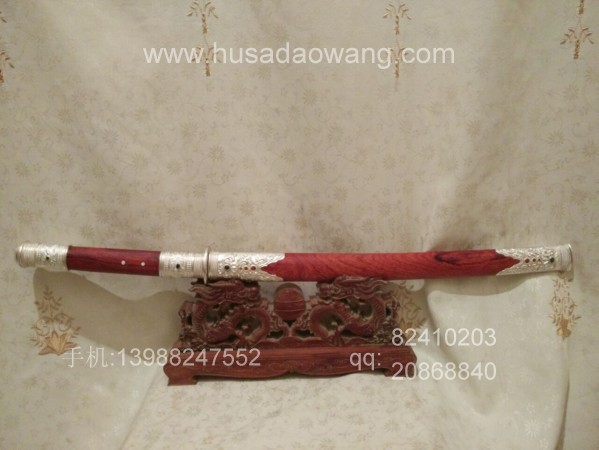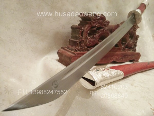 此刀刀条由户撒刀第一刀匠线乔发精选高碳锰钢纯手工千锤百炼锻打而成,刀型为传统马刀款型,劈砍轻便有力,刃口坚硬锋利,粗锋轻松砍铁,细锋过竹削铁,性能卓绝!刀柄刀鞘采用精选老红酸枝全手工制作,刀鞘刀柄精包99纯银,用银分量足,精美厚重!纯银刀装共镶嵌八颗天然翡翠,更显华贵!