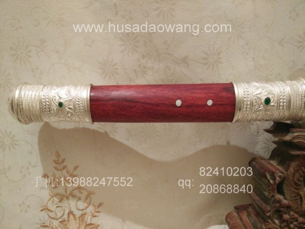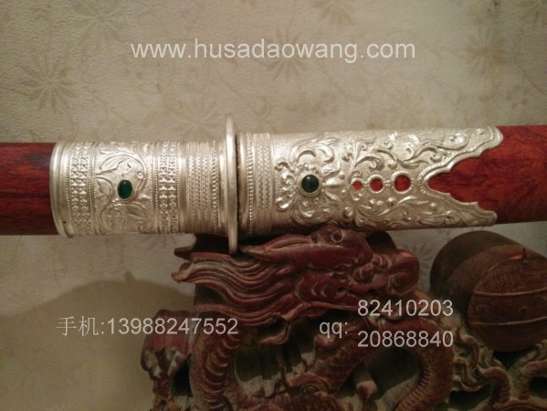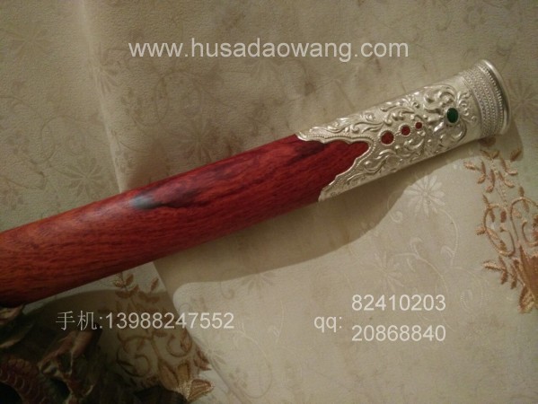 制作工艺:户撒刀传统纯手工锻打工艺 名匠线乔发 99纯银配饰外镶翡翠 优质老红酸枝刀鞘刀柄 砍铁不伤