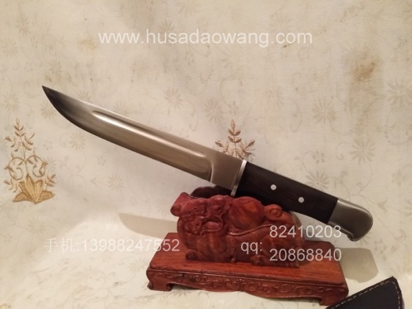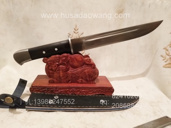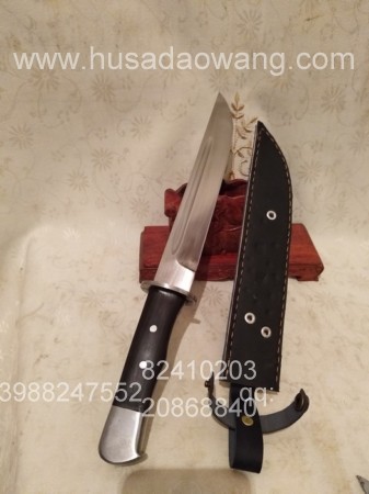 商品介绍:此刀有本站投资商独家进口的高档进口钢材纯手工锻打而成,相对于其他钢材,此种 钢材硬度和防锈能力更为提高,可以达到接近刮毛而砍铁不伤的性能指标,因钢材硬锻打难度和特殊淬火技术要求更高,因此产量有限,此刀设计为刺刀款型,兼顾猎刀性能,刀条一体全龙 骨,更加结实耐用,护手和刀柄尾端手工加钢,在户外有敲击功能,刀柄为非洲黑檀,极品好 刀,大家抓紧时间订购,