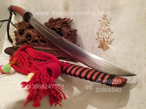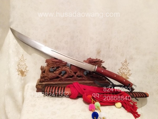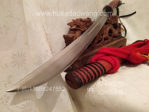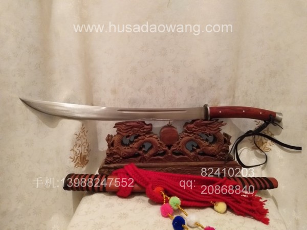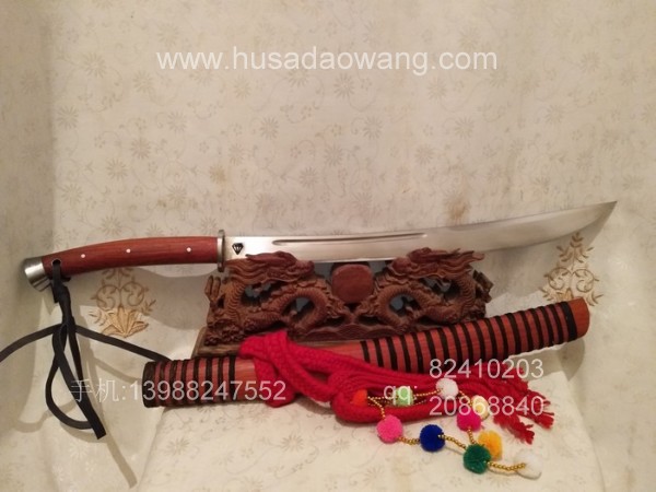 商品介绍:此刀由本站投资商独家进口的高档进口钢材纯手工锻打而成,相对于其他钢材,此种钢材硬度和防锈能力更为提高,可以达到刮毛而砍铁不伤的性能指标,因钢材硬锻打难度和特殊淬火技术要求更高,因此产量有限,此刀经典民族款苗刀造型,刀身流畅美观,刀条一体全龙骨设计,坚固耐用!尾端手工加钢,户外可做敲击使用,刀条特殊锻制千锤百炼而成,刃口坚硬,防锈能力出众,手感一流!刀鞘刀柄精选缅甸老红酸枝,外缠综丝而成,民族风格浓郁!大家抓紧时间订购。