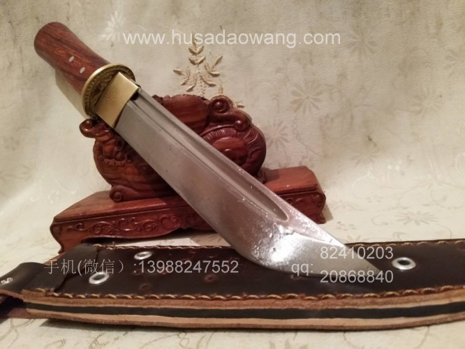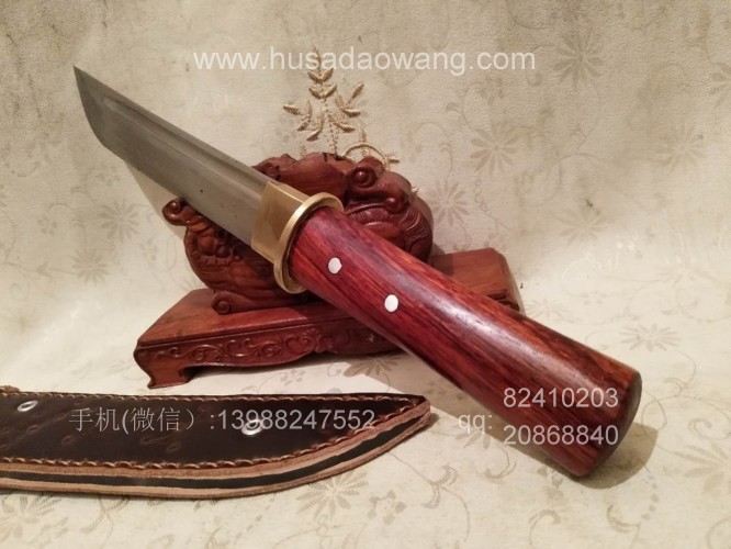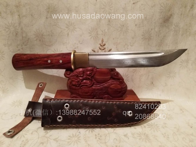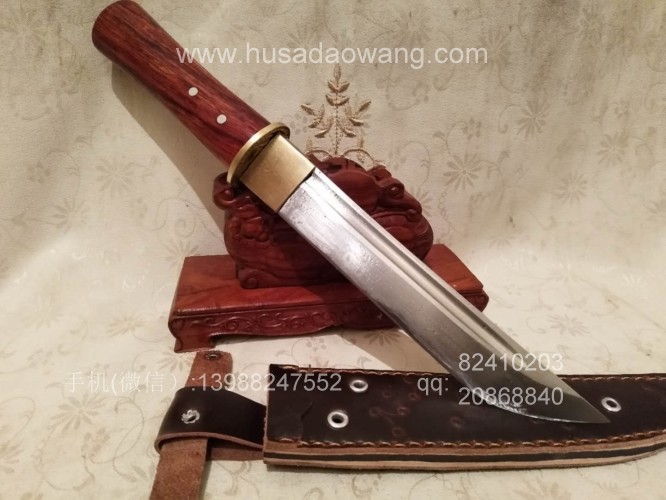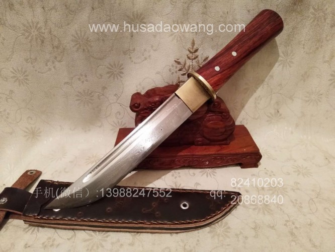 商品名称:户撒阿昌刀精品直刀(杨茂芳制作) 商品规格:刃长20厘米左右 全长32厘米左右 厚度6毫米左右 商品详情:此刀为被列为云南省级非物质文化传承人的著名刀匠杨茂芳全手工锻打制作,刀条钢材为精选高碳锰钢,刀条千锤百炼而成,刃口局部淬火,刀条采用手工平磨,切割更为顺畅,独到的淬火方式使得刀条刚柔相济,粗锋砍铁不伤,细锋的话可达到轻松刮毛,配手工缝制的牛皮鞘,更加便携,刀柄为优质红酸枝贴合手型制作,握感舒适。此刀户外车载防身皆可,欢迎大家订购!