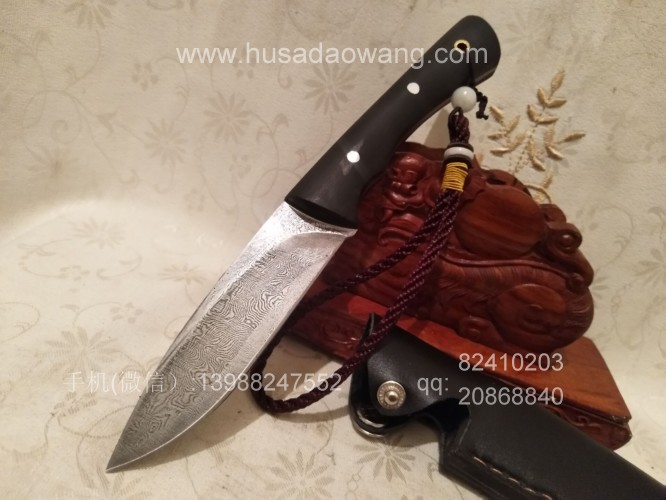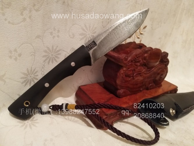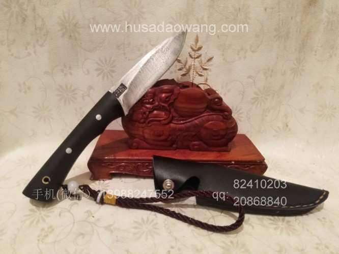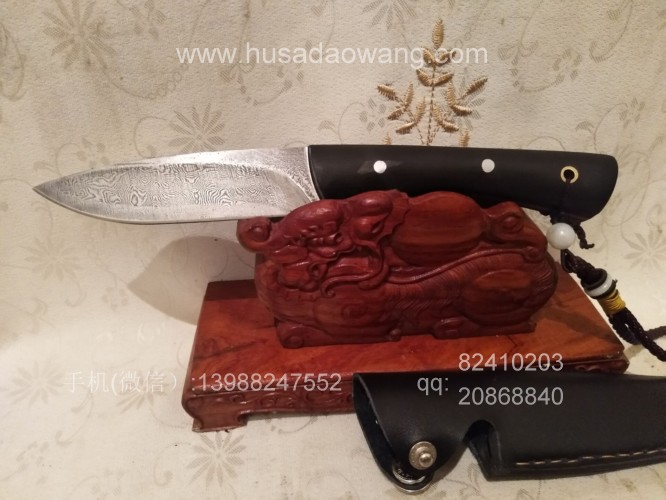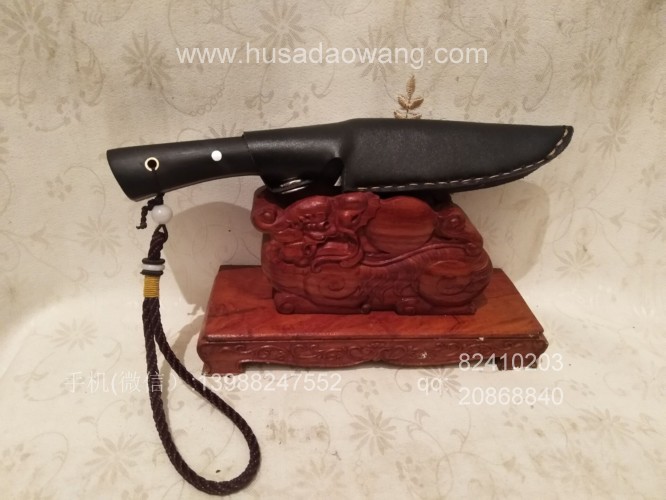 户撒刀简介: 此刀为户撒优秀工匠全手工锻打而成,刃材采用百炼花纹钢反复锻打后户撒传统配方热处理而成,刀身花纹绚丽,刃口经过锻打和淬火后更加致密,硬度大大提高,全龙骨刀身解释耐用,此刀经过匠人多道手工打磨后极为锋利,可以轻松刮毛,刀鞘采用牛皮手工缝制,刀柄为优质非洲黑檀手工制作,手感舒适握感极佳!此刀小巧便携,随身皮包都可携带,防身利器!