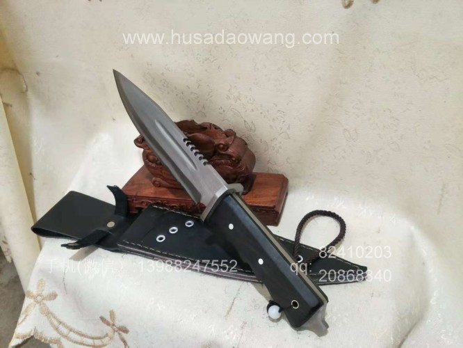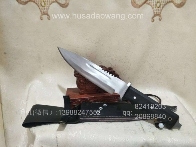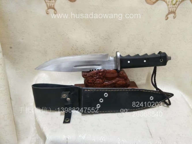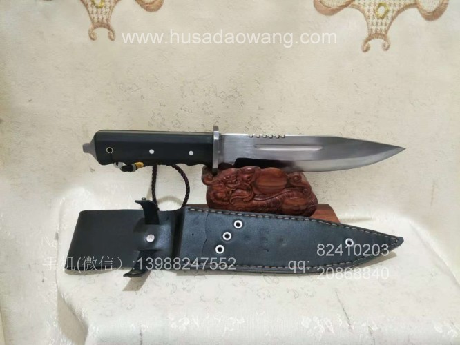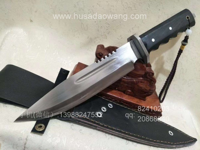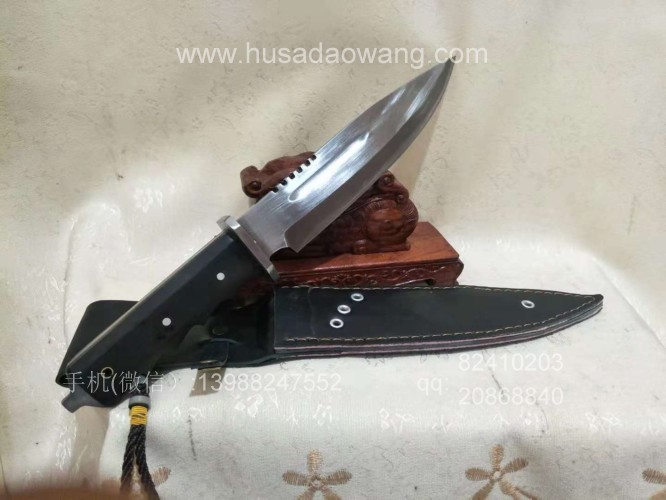 户撒刀介绍:此刀为户撒优秀匠人采用优质高弹锰钢纯手工锻打制作的精品狼牙求生刀,刀条反复锻打并配方淬火而成,粗锋砍铁轻松顺畅,细锋可以锋利刮毛,此刀一出大受刀友欢迎和关注,刀体美观流畅,刀体全龙骨一体设计,硬度极高,尾端手工制作破窗锥,危机情况下可用来破窗,手柄黑檀木配合手型,更舒适不易滑脱!握感压手,一把不可多得的户外用刀!