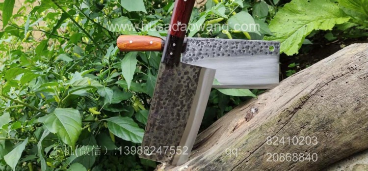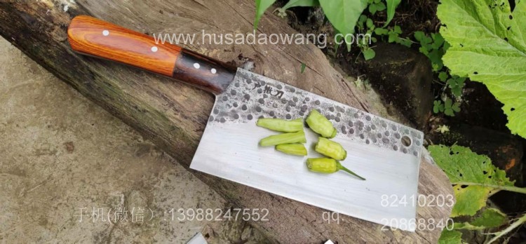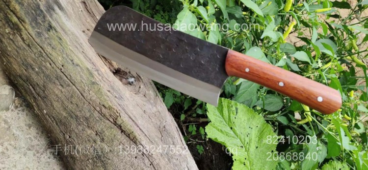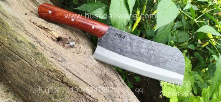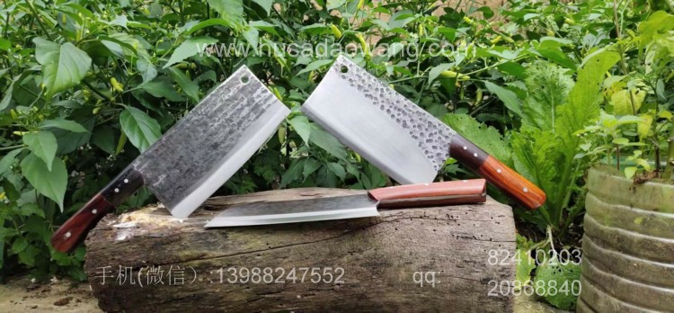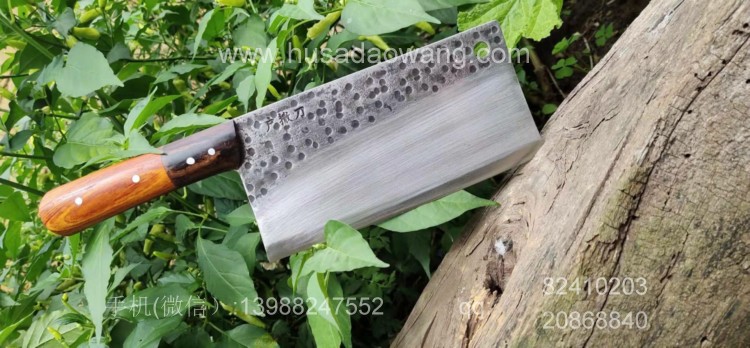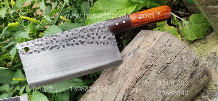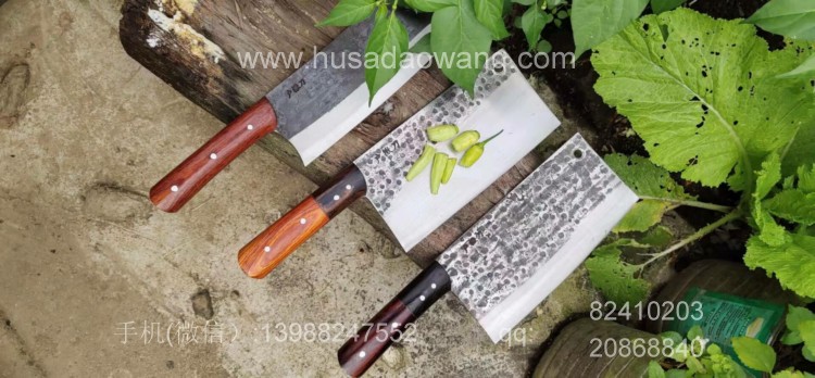 商品名称:户撒阿昌刀王手工锻打蜂窝菜刀 商品规格:刃长20厘米左右 刃宽9厘米左右 (黑色面那把刃长19厘米左右 宽度6厘米左右) 商品简介:此菜刀由户撒刀高级技师项老塞大徒弟亲手打制,钢材选用精挑进口三菱汽车钢板顺手工锻打而成,传承的古法户撒刀锻打工艺,千锤百炼而成,配方淬火,整刀刚柔相济,经过我们三道磨石的细心研磨,刃口锋利可挂汗毛,刃口经过铁锤反复锻打,密度增强,所以菜刀的保持性要优于市面上绝大多数菜刀!此菜刀不仅获得网上刀友的众多好评,在当地也很受欢迎!