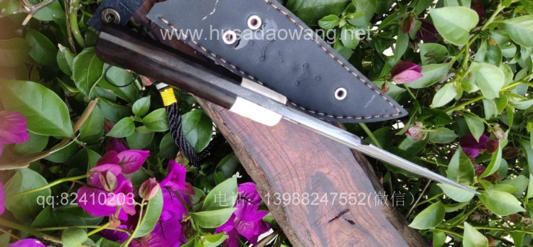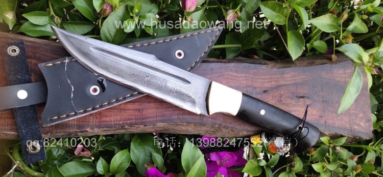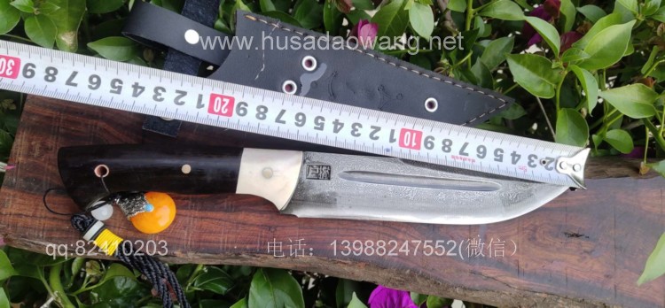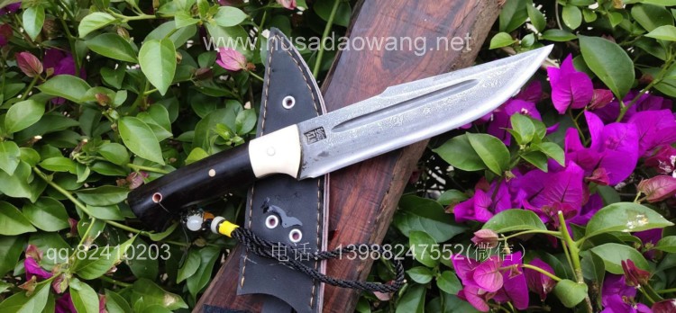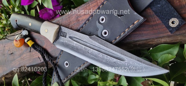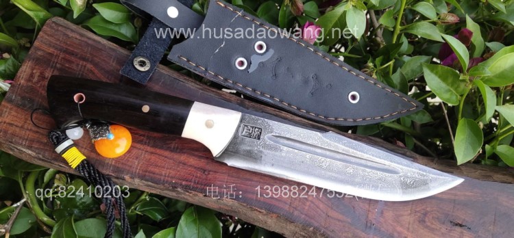 商品简介:此款小猎刀刀体精选特硬百炼花纹钢手工锻打而成,一体全龙骨锻造结实耐用,匠人全锤百炼后独特配方淬火而成刀体刚柔相济,硬度极高,粗锋砍铁不伤,磨锋利的话可以锋利刮毛,猎刀造型简洁犀利劈砍穿刺都非常有力!刀柄为野生鹿角和牛角贴片而成非常具有观赏及收藏性!户外防身和车载的利器!欢迎大家咨询!