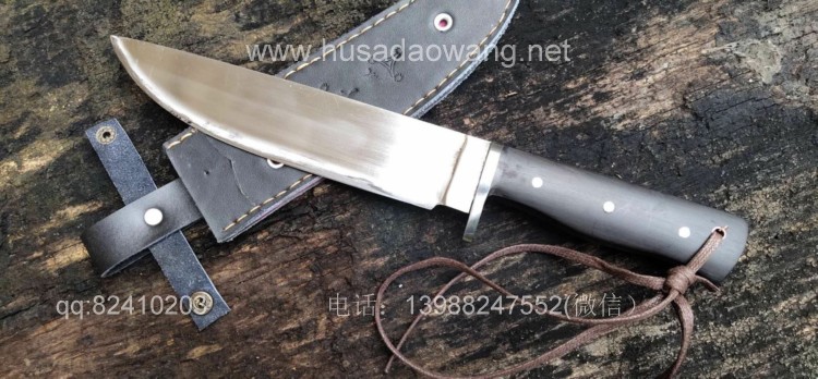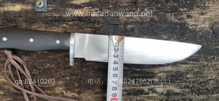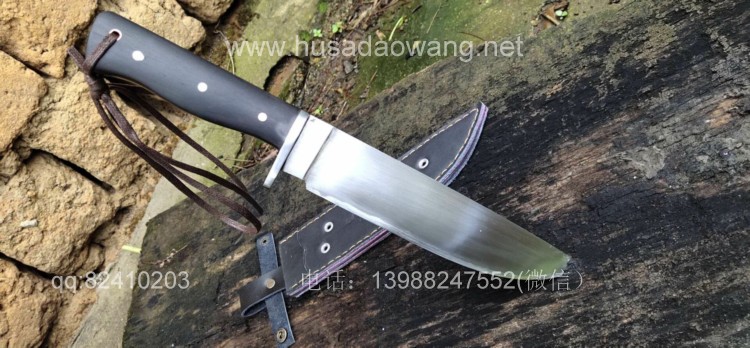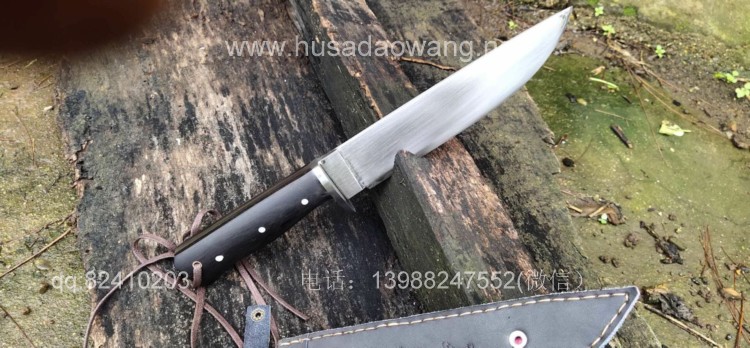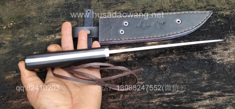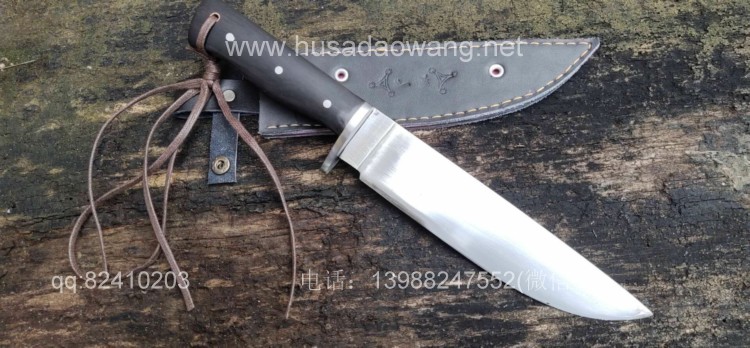 商品名称:户撒刀王(阿昌刀)精品全龙骨猎刀 商品规格:刃长20厘米左右 全长31厘米左右 厚度5毫米左右 宽度3.9厘米左右 商品特色:户撒传统手工锻打 一体全龙骨 手感极好 刀型漂亮 商品简介:此刀为户撒优秀刀匠精选军用解放汽车弹簧板全手工锻打而成,整体配方淬火,刚柔相济!流线刀身,一体全龙骨锻打更加结实耐用!粗锋砍钉削铁,手工磨锋利后可以轻松刮毛,配传统手工缝制牛皮刀鞘,方便随身携带,刀柄为全龙骨结构,两侧手工贴优质黑酸枝木,手感一流!此刀户外切削劈砍俱佳,结构简单耐用,收藏把玩实用佳品!