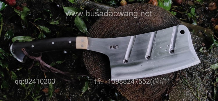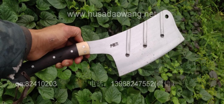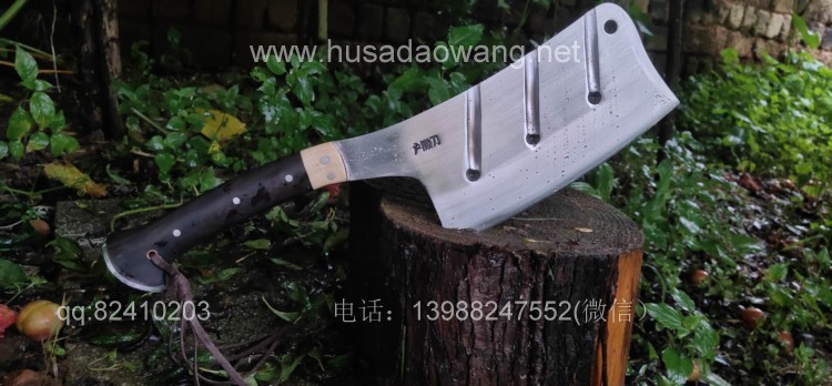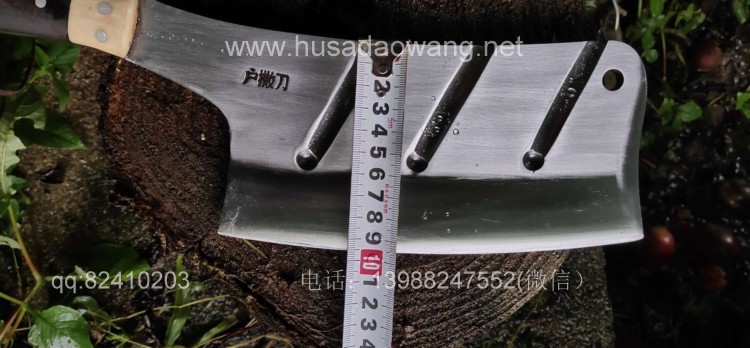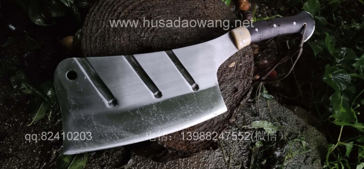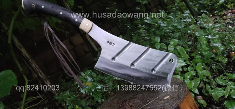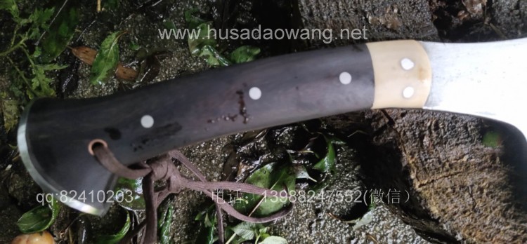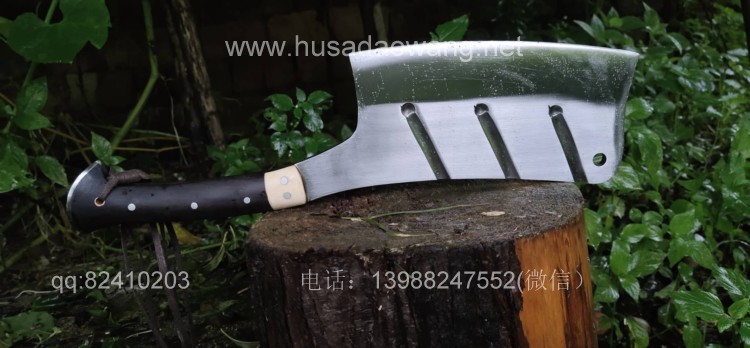 商品名称:户撒刀王(阿昌刀)全龙骨户外加长剁刀 商品规格:刃长20厘米左右 全长41厘米左右 厚度8毫米左右 商品特色:手感超好 劈砍超强 砍钢筋 商品简介:此刀由户撒优秀刀匠精选优质弹簧钢全手工锻打而成,一体龙骨刀身,威武霸气!钢口配方局部淬火,刚柔相济,钢口极好,实测粗锋砍螺纹钢筋不伤刃口,人道并采用黑檀木和野生鹿角贴片,美观耐用,手感极佳!尾端手工加钢,防尾部撞击,刀重2.5斤左右,户外车载防身皆可!不带皮鞘价格580元。